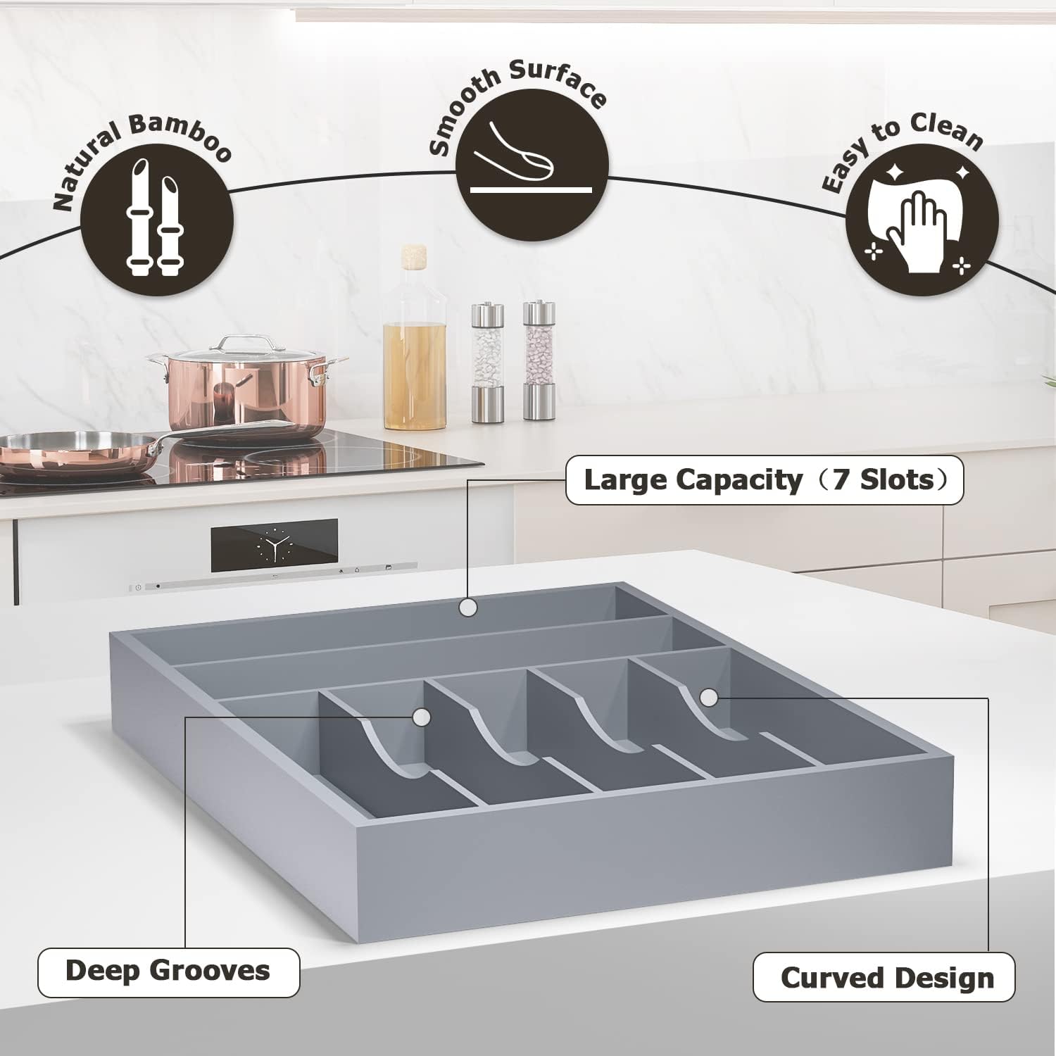 - 【Kitchen Storage】: This beautiful 7-compartments cutlery organizer has 2" deep compartments and a reinforced base; the seam between the divider and the tray is stable and crack-free; dividers with curved design allow easy access to cutlery. Kitchen storage just got a whole lot easier.