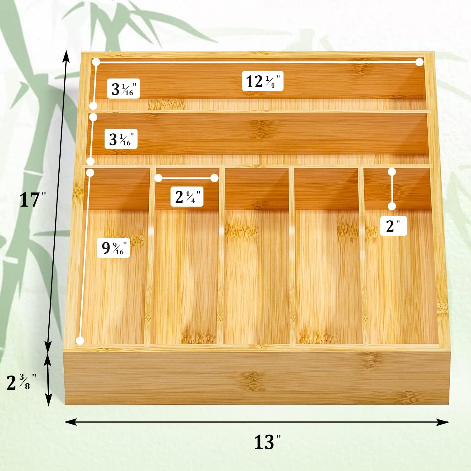 - 【Perfect Silverware Organizer Size】Please Measure Your Drawer Size Carefully Before Ordering to Avoid Any Inconvenience. The overall size of the silverware organizer is about 13”(W) x 17”(L) x 2.4”(H); due to handmade, please allow a slight error within 1/2 Inch.