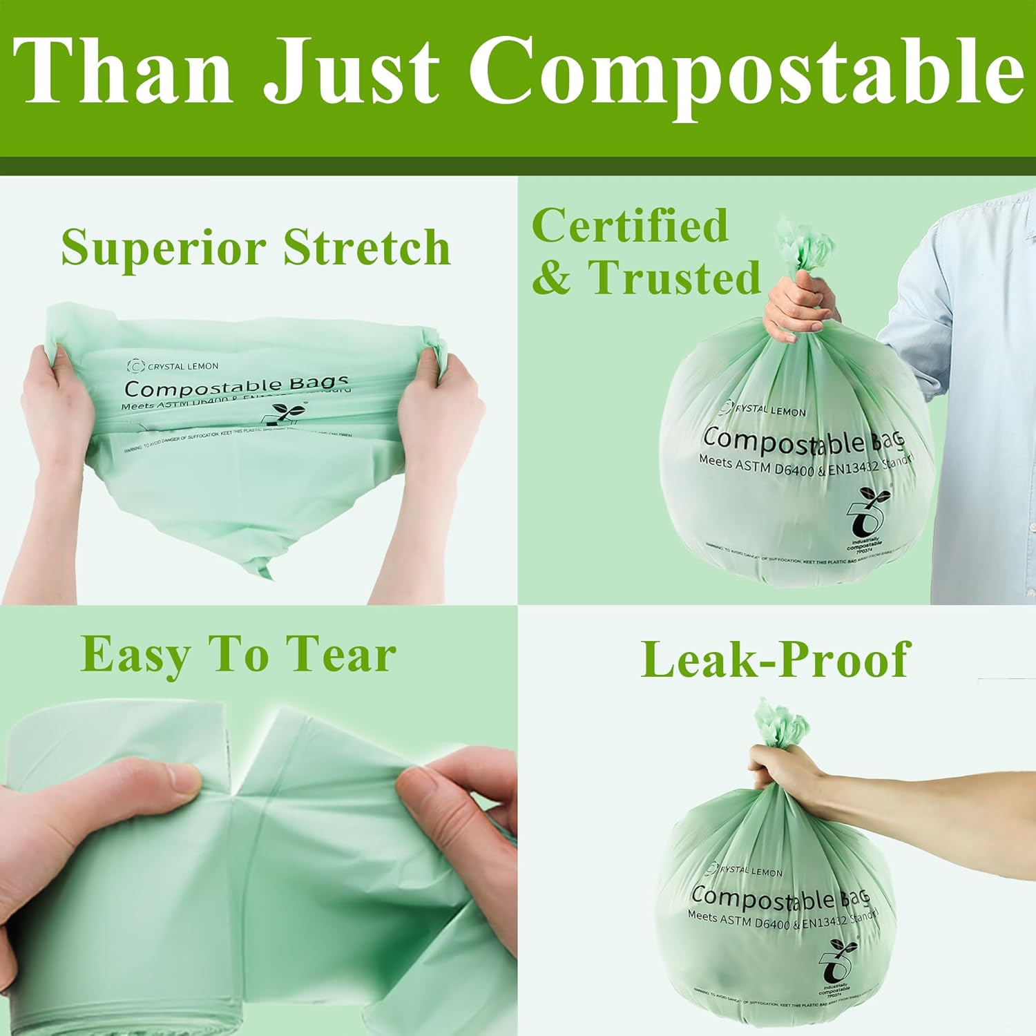 - Ensured Safety and Standards –– Our biodegradable trash bags are produced in compliance with recognized U.S. compostability standards, following ASTM D6400 guidelines. Designed for safe use in home composting, they naturally break down without leaving harmful residues. You can trust these compostable trash bags to hold household or facility waste without introducing toxins, ensuring both safety and eco-friendliness.