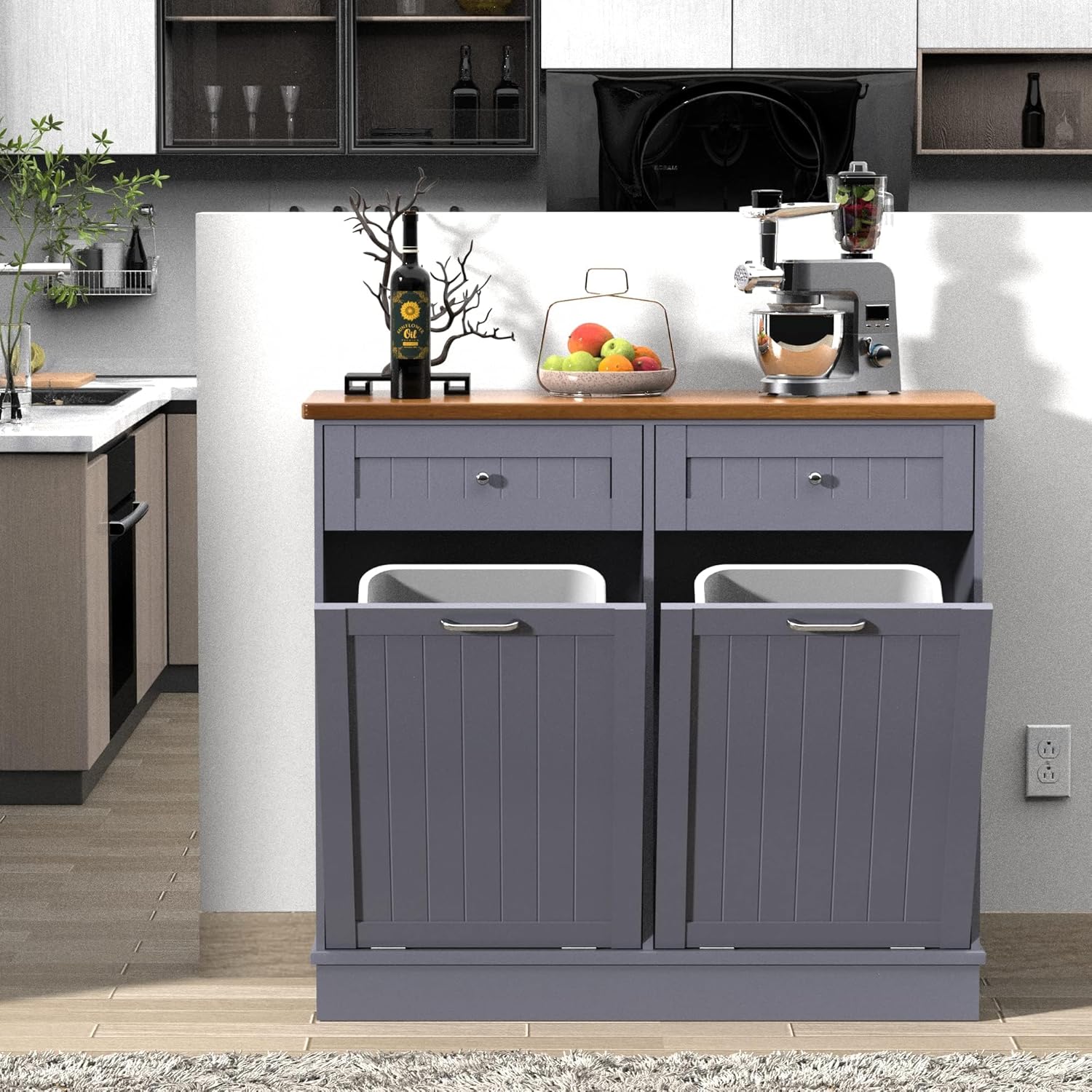 - š”ćKitchen Modern-style Trash Canć The cabinets are simple and practical in design, perfect for dressing up your kitchen, home, apartment, dorm room, laundry room, etc. Combined with 2 pull-out drawers, you can store kitchen supplies, pet food, and the slanted drawer below can even be used as a laundry cabinet