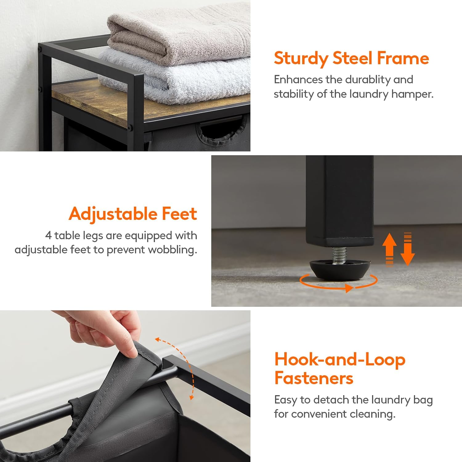 - Versatile Design with Optimal Stability: Our laundry basket organizer is crafted with sturdy particleboard and steel frame. It features a top panel that offers a convenient surface for keeping toiletries like soap, shampoo, and towels within reach. The iron shelf enhances the unit's stability and flexibility with adjustable feet that prevent wobbling.