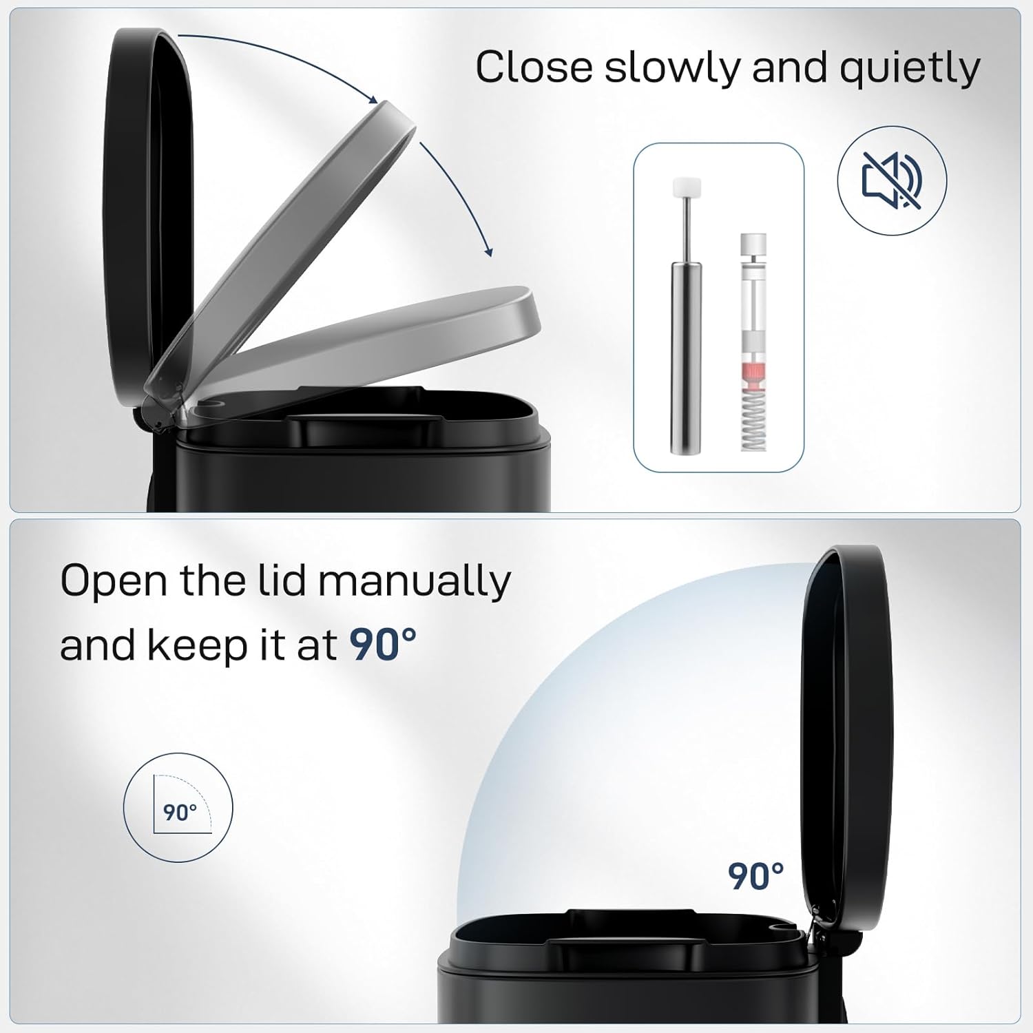 - 【WON'T DISTURB YOU】Using ABS hydraulic deceleration technology, the trash can lid can be slowly and gently closed when the pedal is released, without making a lot of noise, and it will not disturb your family when disposing of garbage.