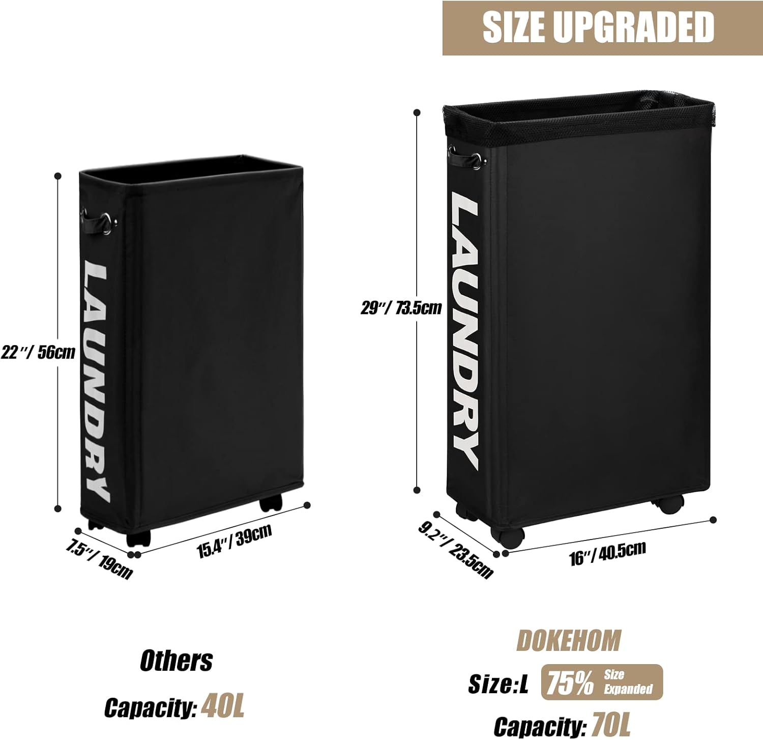 DOKEHOM 29-Inches Enlarged Slim Laundry Basket with Removable Wash Bag on Wheels, Collapsible Rolling Laundry Hamper, Foldable Narrow Corner Clothes Storage Bins (Black)