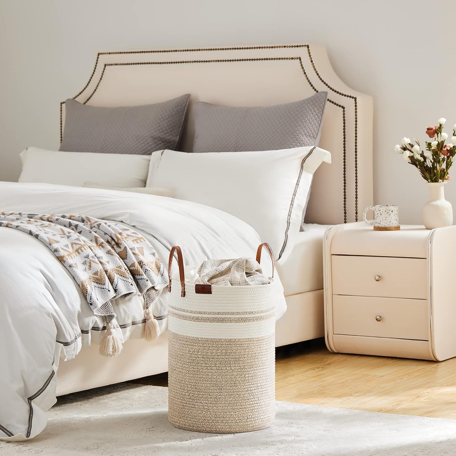 - ❤【MINIMALIST DECORATIVE BASKET】 This cotton rope woven basket with simple color splicing, leather handles and label can match different kinds of rooms, like living room, bathroom, bedroom, dorm, laundry room and nursery room. The round basket is also a fantastic gift idea for housewarming, baby showers, Valentine's Day and any other occasions.