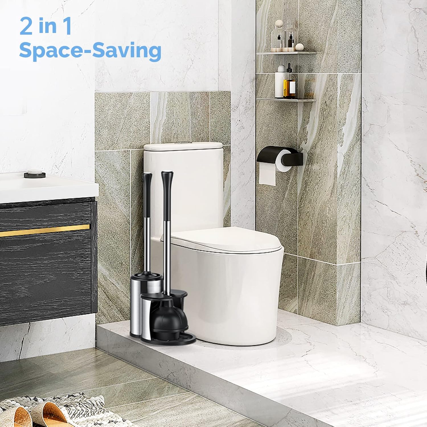 - 2-in-1 Toilet Brush and Plunger Combo: The 2-in-1 design allows you to get a toilet plunger and a toilet brush at once, and the high-quality stainless steel construction is not only beautiful but also durable, creating a modern and stylish bathroom aesthetic while providing you super Reliable bathroom cleaning accessories. The sturdy base is not easy to tip over, keeping your bathroom clean and dry.