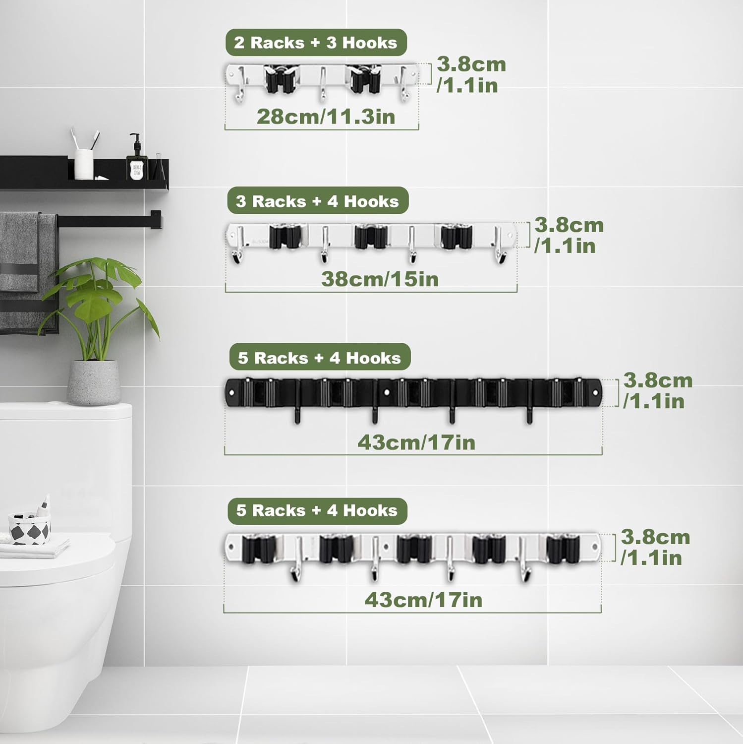 - Organizing & Saving Space: The broom and mop organizer wall hanging with 5 Racks and 4 Hooks organizer your brooms, mops, rakes, garden tools, laundry room storage and more, efficiently uses the wall space. The mop rack provide additional hanging space for miscellaneous items , expanding its life space invisibly.