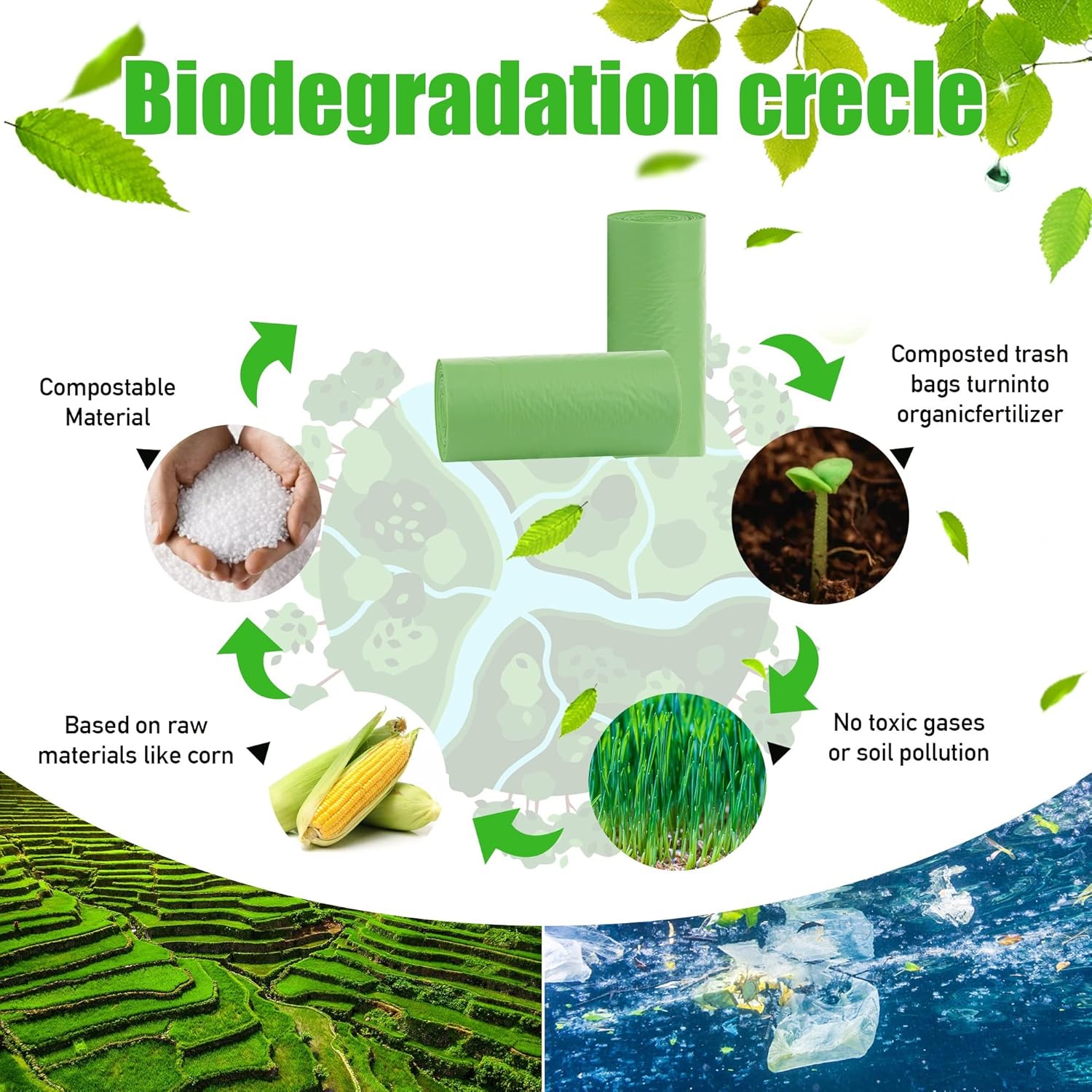 - INSTRUCTIONS FOR USE:Our organic garbage bag are made of starch-based materials. Avoid overheating, place the compost bag in a cool and dry place and use it up within one year after purchase.
