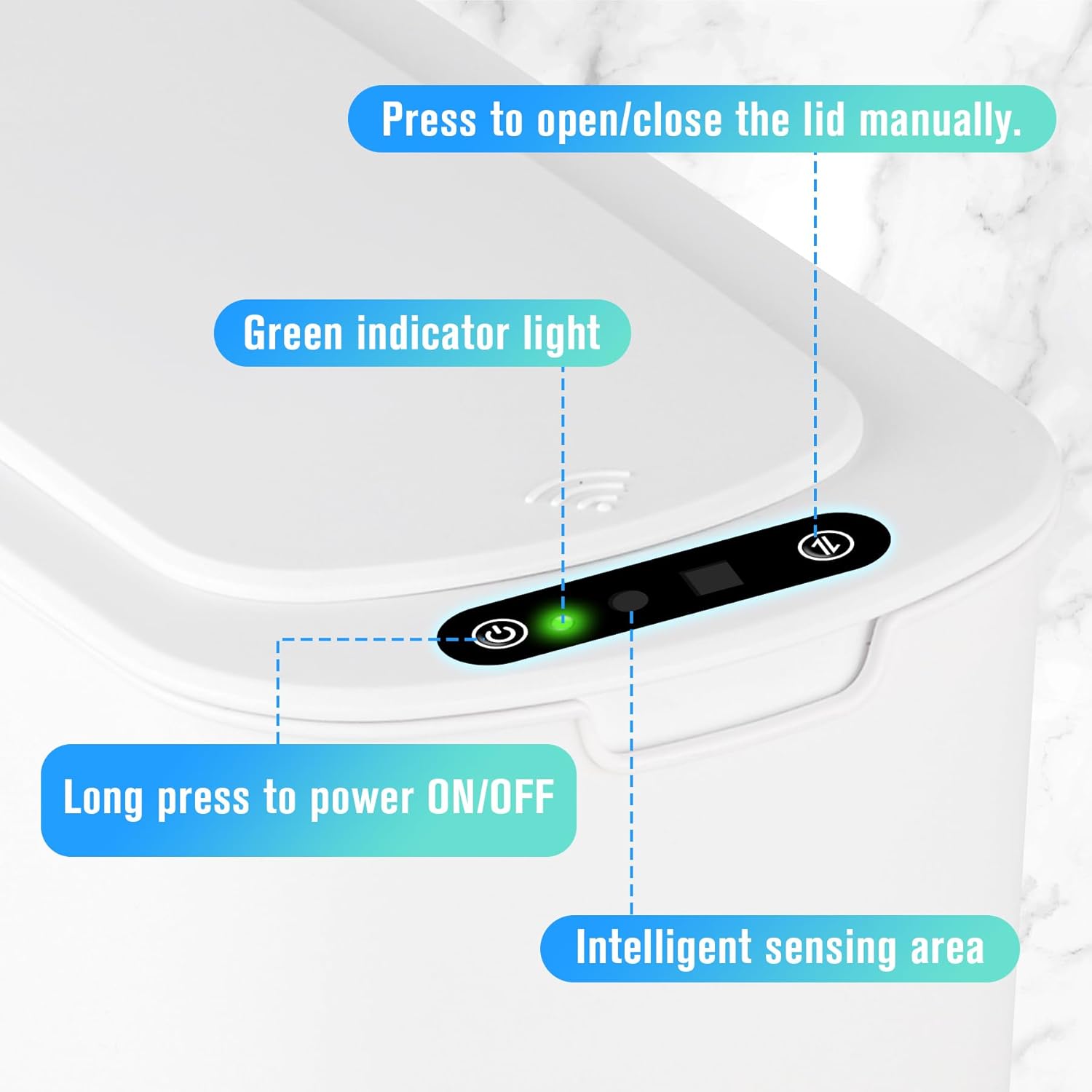 - Stay open: The lid remains open when your hand or other object is in the sensing area. You can also press the button to open or close the lid manually