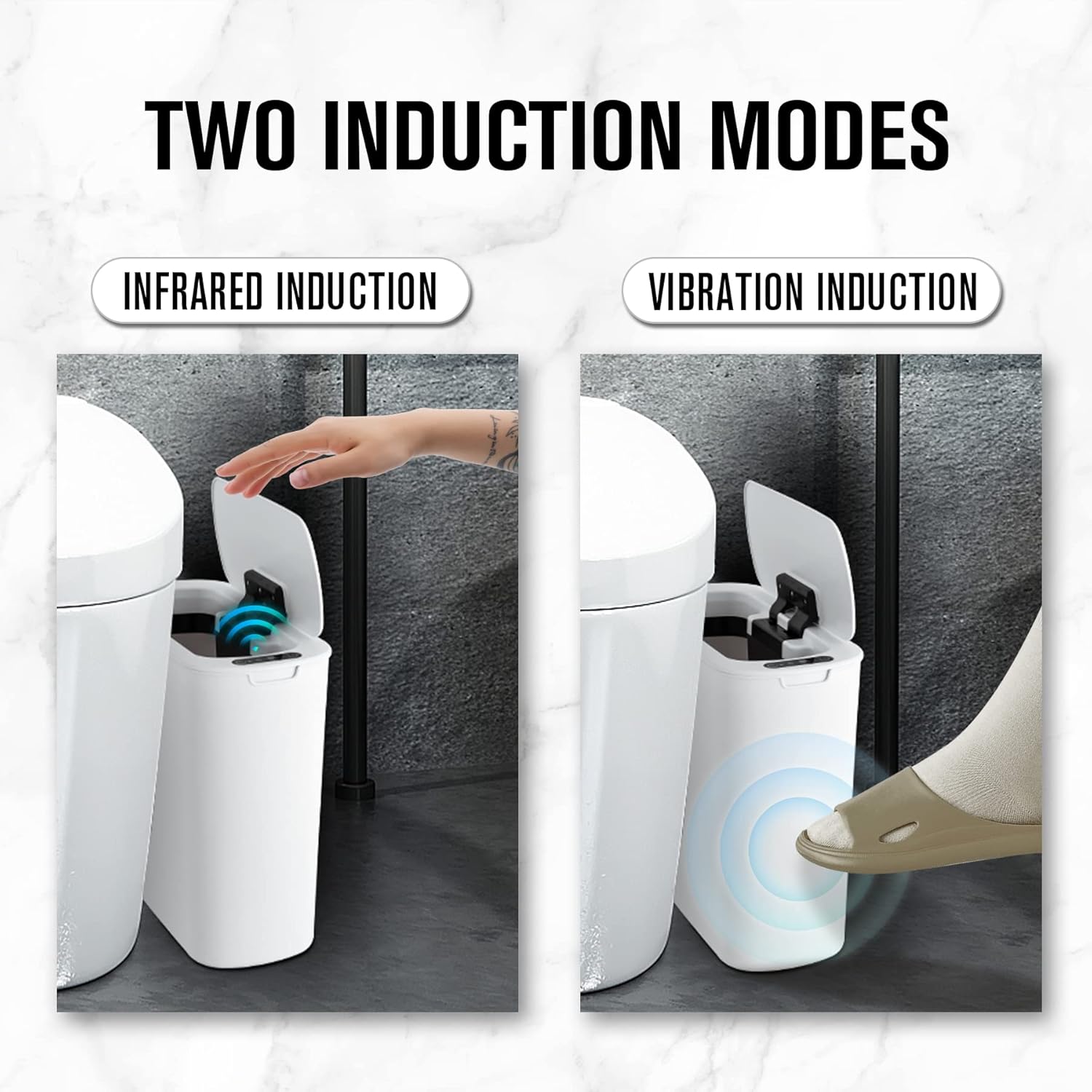 - Designed for Narrow Spaces: Our smart trash can has a slim shape that makes it a fit in a bathroom or wherever space is tight. Are you still annoyed that the narrow space in the room is being wasted? Use it to improve your space utilization