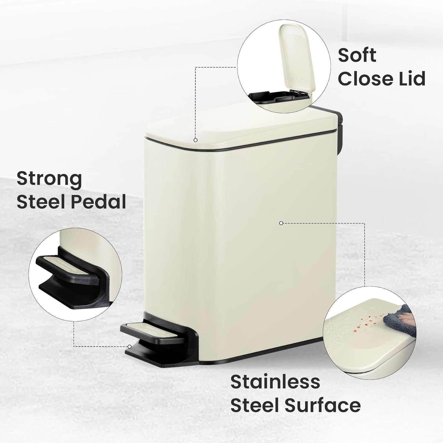 - Sturdy Steel Pedal: Upgrade foot pedal of the bathroom trash can combines stainless steel tread with plastic material, making a lighter and more comfortable pedaling experience. Engineered to last over 150,000 steps, allowing you to step more than 20 steps a day for 20 years