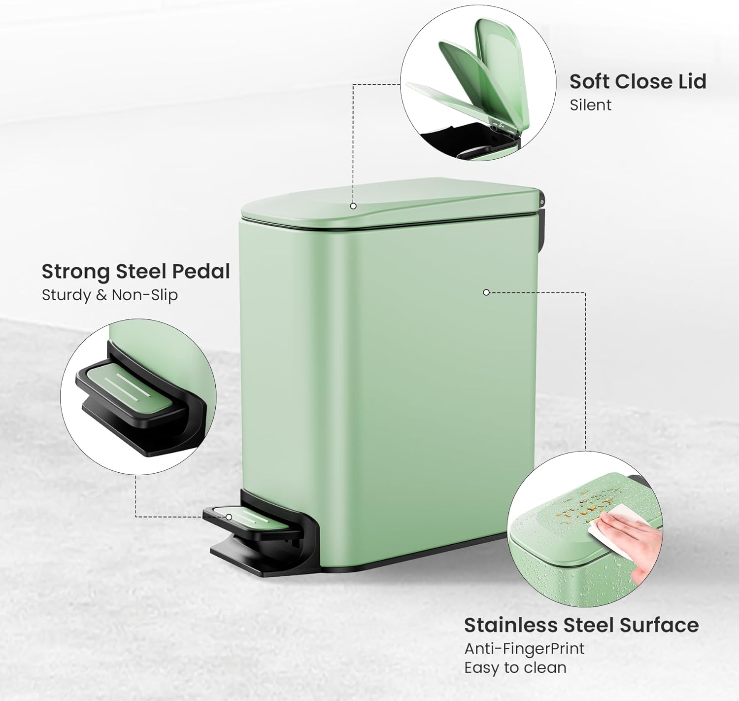 Cesun Small Bathroom Trash Can with Lid Soft Close, Step Pedal, 6 Liter / 1.6 Gallon Stainless Steel Garbage Can with Removable Inner Bucket, Anti-Fingerprint Finish (Matt Green)