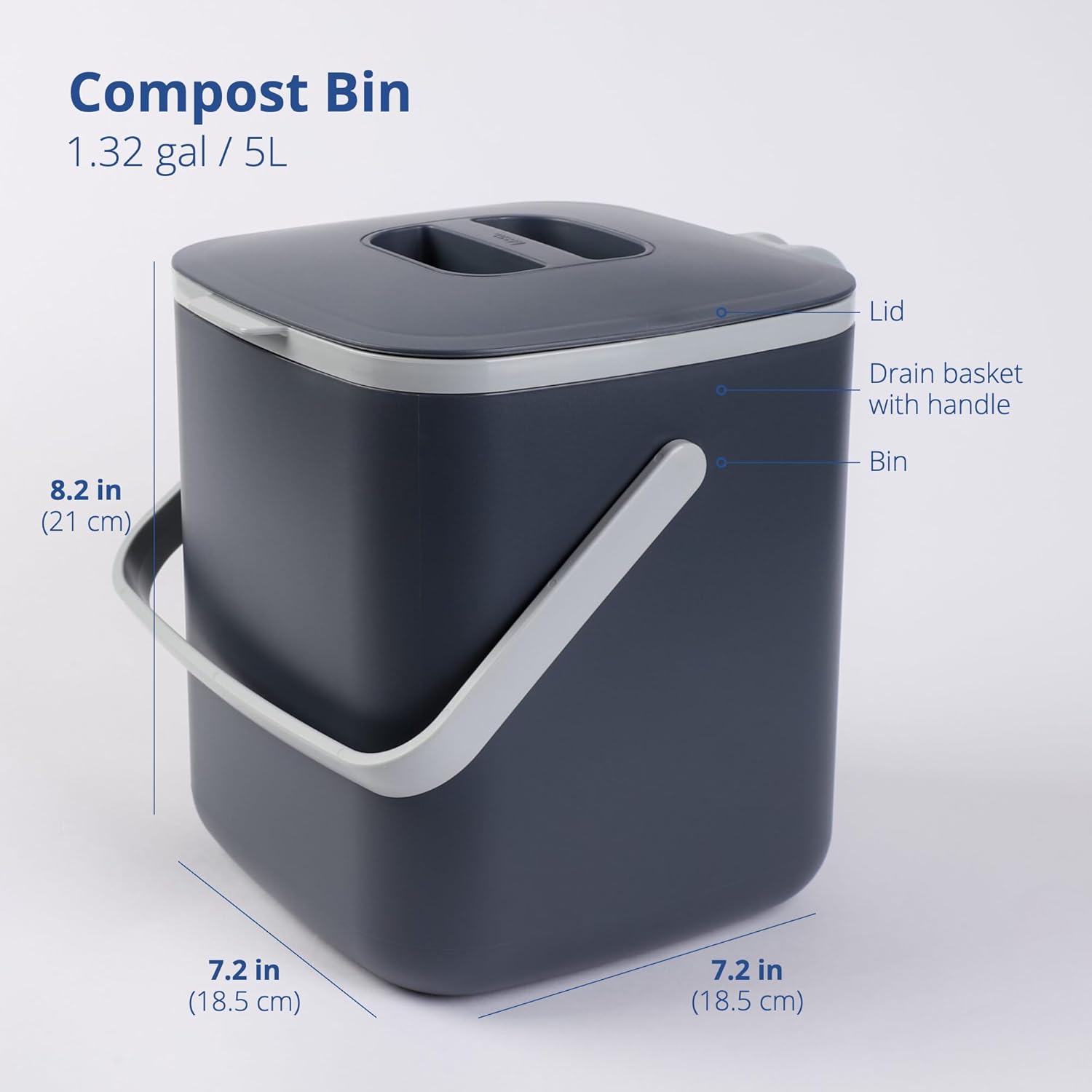 - AVAILABLE IN TWO SIZES - This compost bin is perfect for a 4-person household. It has a capacity of 1.32 gallons or 5 Liters and the outer dimensions measure W7.2 x H8.2 x D7.2 inches.