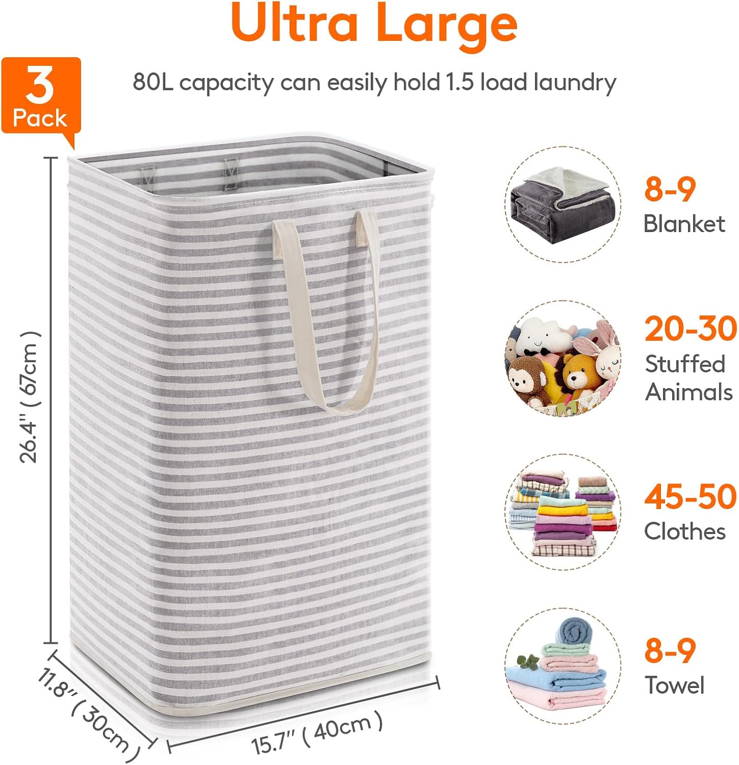 - Ultra Large: The laundry hamper measures 15.7 x 11.8 x 26.4 inches (L x W x H) with a capacity of 80L and 2 of set which easily contains 1.5x2 loads of laundry. It can hold a lot of items such as dirty clothes, wet towels, sheets, etc.