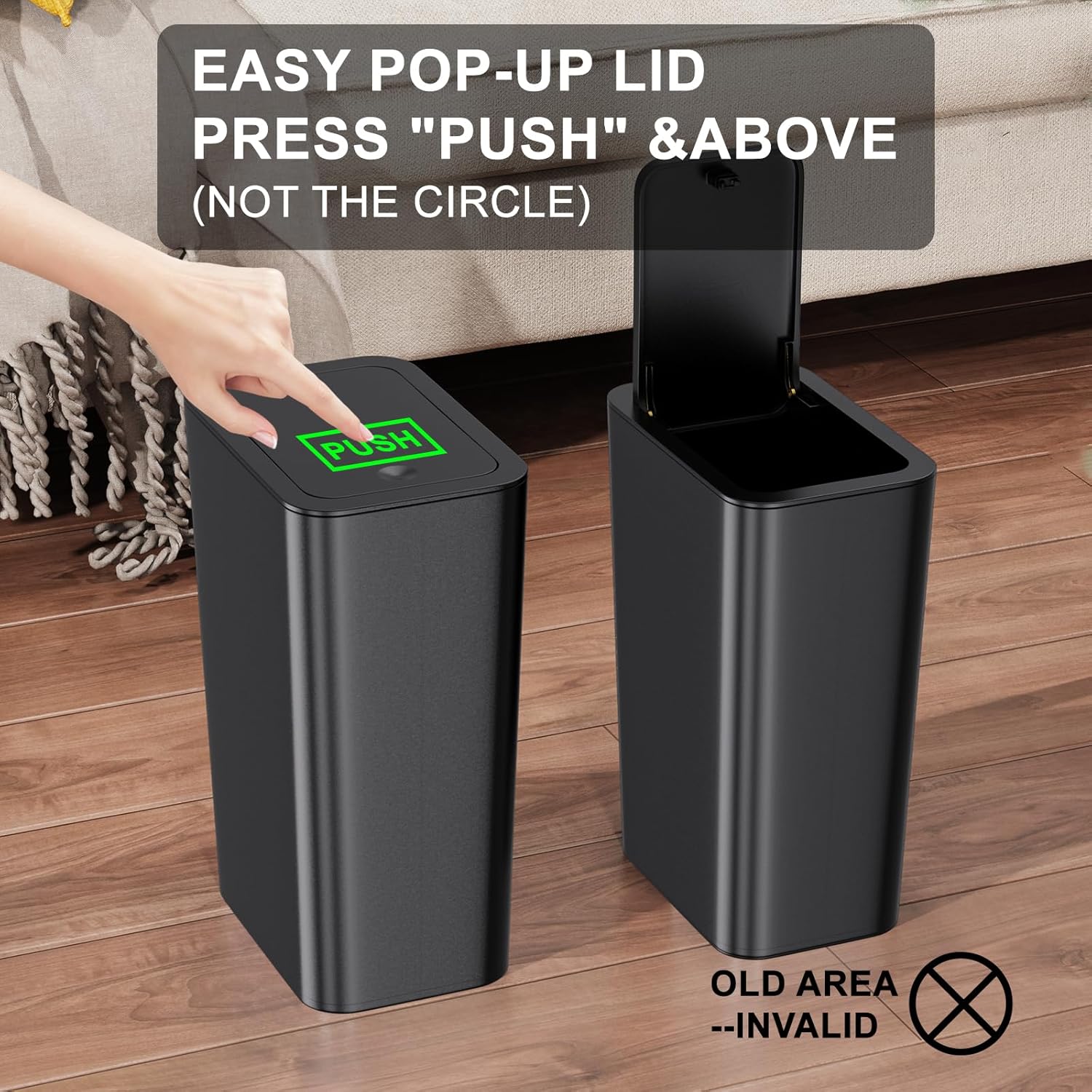 - 3 Pack Premium Pop-Up Trash Cans with Lids: Our small trash cans includes 2 pack 4 Gal kitchen trash can with lid and 1 pack 2.6Gal bathroom trash can. These black bathroom trash cans with lids are great for any home or office, can be used as kitchen trash can, trash can bathroom, bedroom trash can,office trash can. Small trash can with lid features a unique pop-up press lid can seal and lock flavor, avoid garbage exposure, our trash can kitchen is sure to bring you neat space and fresh air