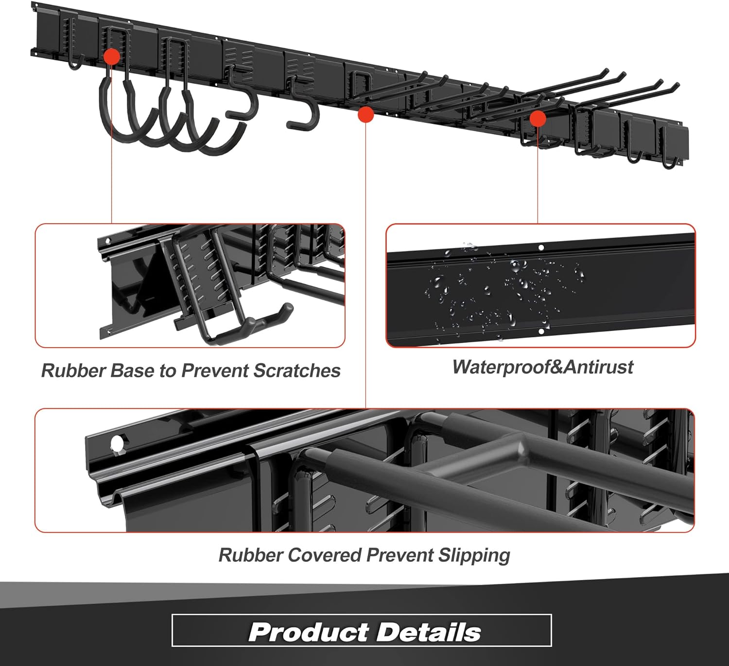 - Perfect Fit: The 17" total length of the slot board and 16" distance between the outermost two holes are designed to perfectly fit the standard 2"x4" stud spacing in American homes, ensuring the hanging point is in the center of the wooden board for maximum stability. The hooks are rubber-coated (protect your tools from slid and damage) and removable, you can customize the spacing between the attachments on the 68" steel rail (4 panels) to meet your needs.