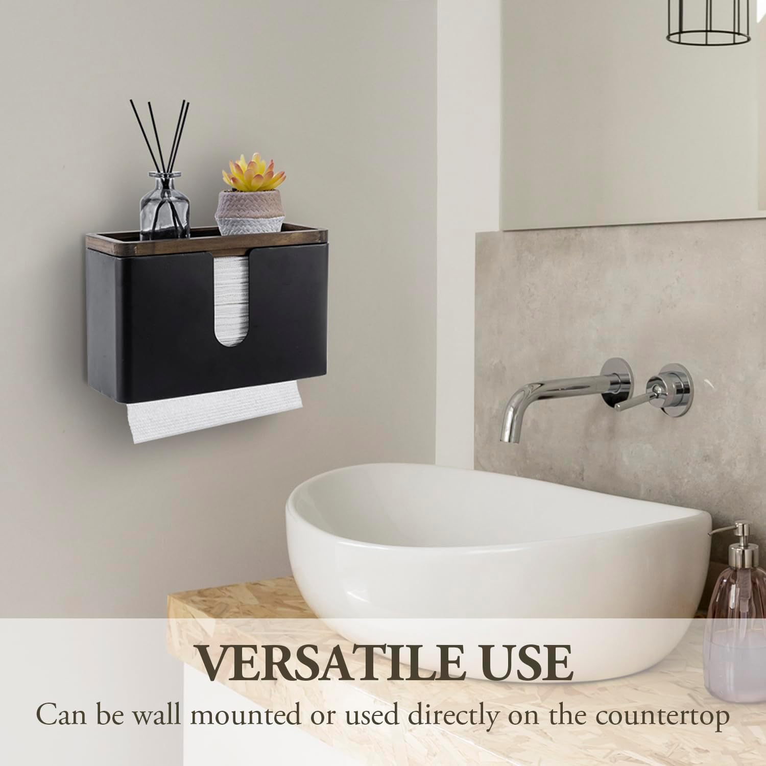 MyGift Deluxe Modern Matte Black Metal Folded Commercial Paper Towel Holder with Rustic Burnt Solid Wood Tray Lid, Wall Mounted Trifold Multifold Z Fold Disposable Napkin Dispenser