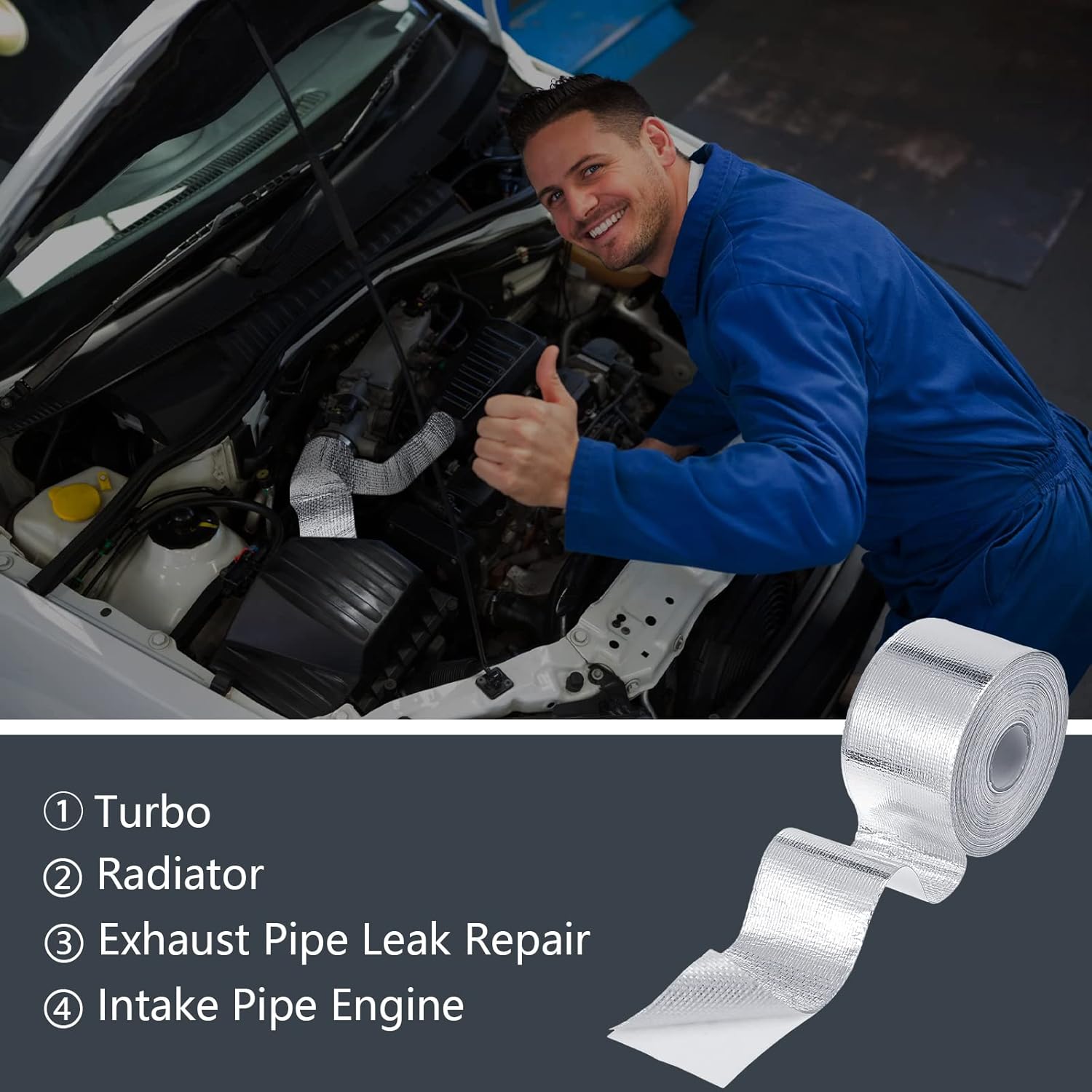 - Quality Material: the adhesive heat shield tape is made of glass fiber fabric with an aluminized outer facing, which is elasticity, wear resistance, heat insulation, high temperature resistant, corrosion resistant and waterproof, and strong adhesion; This foil tape can provide ultimate protection from extreme heat as well as oil spills, dirt, grease and road grime