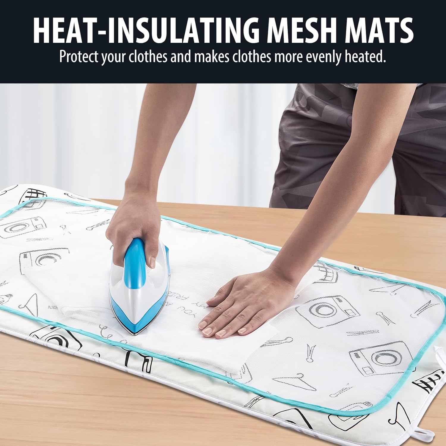 - INSULATION PROTECTIVE MESH: This table top ironing mat comes with a heat insulating and breathable net, meticulous and uniform mesh density makes clothes more evenly heated during ironing, effectively protects your clothes, especially dark clothes and expensive clothes