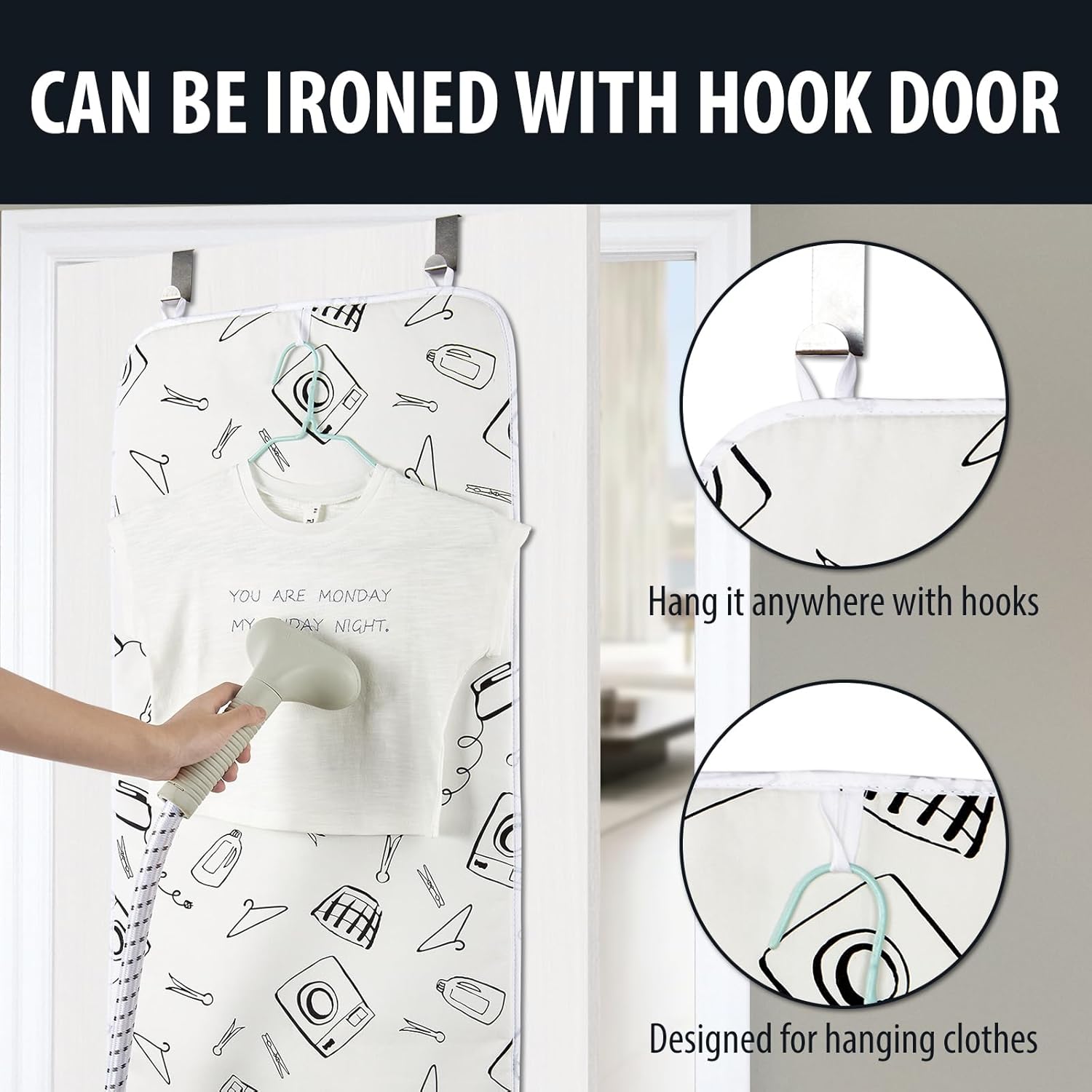 - HANGING IRONING DESIGN: There has three hanging holes on this mat, two for hanging on the door or other places. The middle one is for hanging clothes. Can be used as a over the door ironing board. You are not limited on the table top for ironing. This item is good partner for steam iron. Two hooks are included