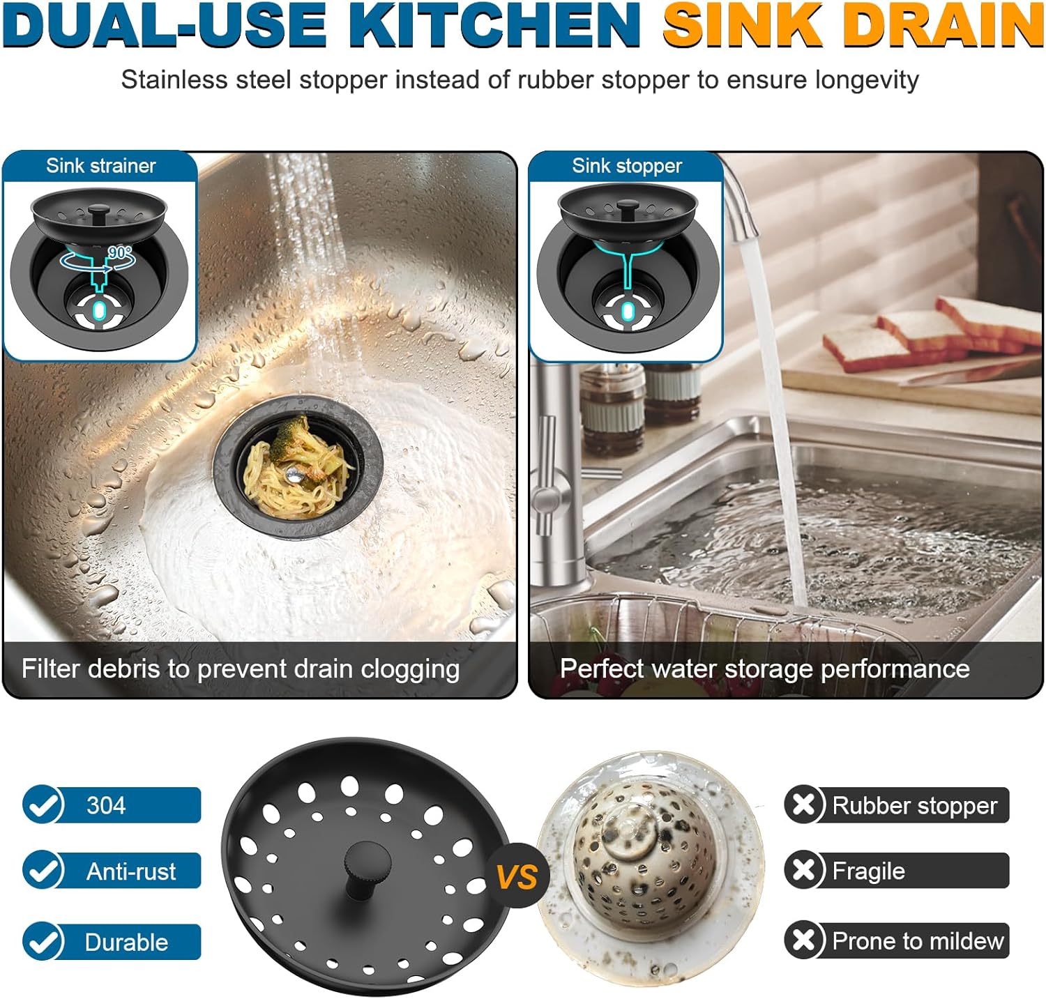 - BUILT TO LAST -- Black kitchen drain assembly is made of 304 stainless steel, which is durable, rust and corrosion resistant. Perfectly fits most US home and commercial kitchen sinks with a 3.5" drain hole and supports up to 0.43" sink thickness