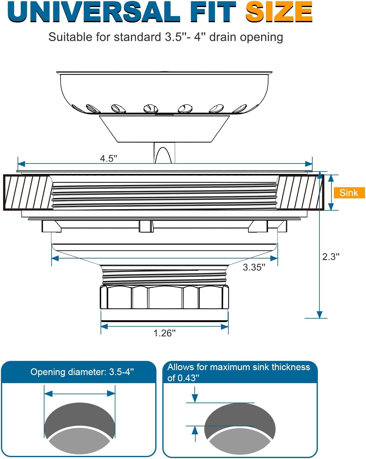 - BUILT TO LAST -- Kitchen drain assembly is made of 304 stainless steel, which is durable, rust and corrosion resistant. Perfectly fits most US home and commercial kitchen sinks with a 3.5" drain hole and supports up to 0.43" sink thickness