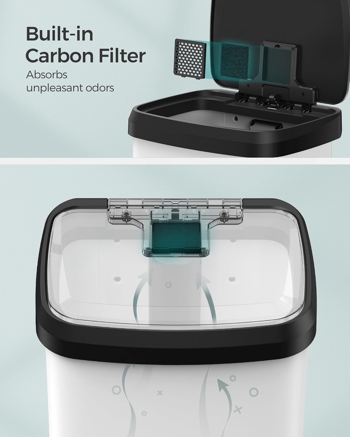 - [Thoughtful Detailing] The carbon filter in the lid helps absorb unpleasant odors, keeping your kitchen smelling fresh. Included are 15 liner bags (12-14.5 gallons) that perfectly fit this kitchen can