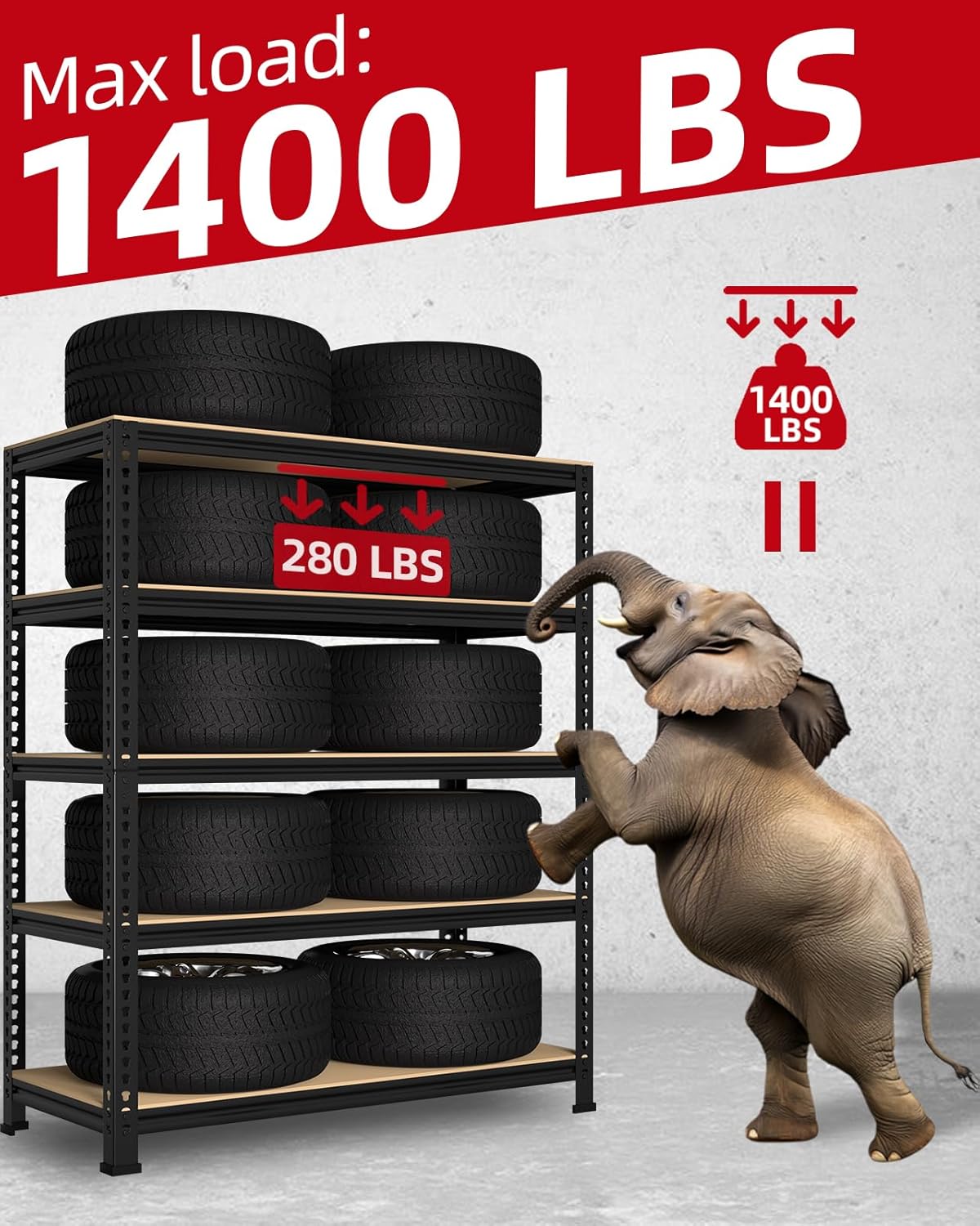 - ă HEAVY DUTY & LONG-LASTINGă: This 5-tier garage shelving is made of high-quality 0.3" thick MDF boards and heavy duty galvanized metal frame, sturdy and enduring. The metal frame is covered with premium powder coating to give it a smooth surface. Each shelf holds up to 280 lbs, 5 tier shelves' total max load weight is 1400 lbs