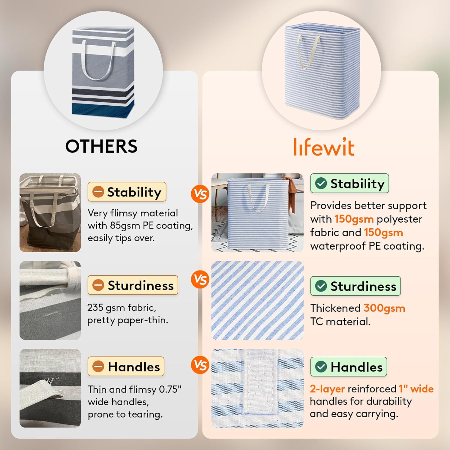 - Easy to Carry: Most clothes hampers for laundry need both hands to carry, but ours can be carried with one hand. The handles are reinforced with strong stitching and are long enough for single-handed carry. Our large laundry baskets can be easily carried up and down stairs or to a laundromat with ease.