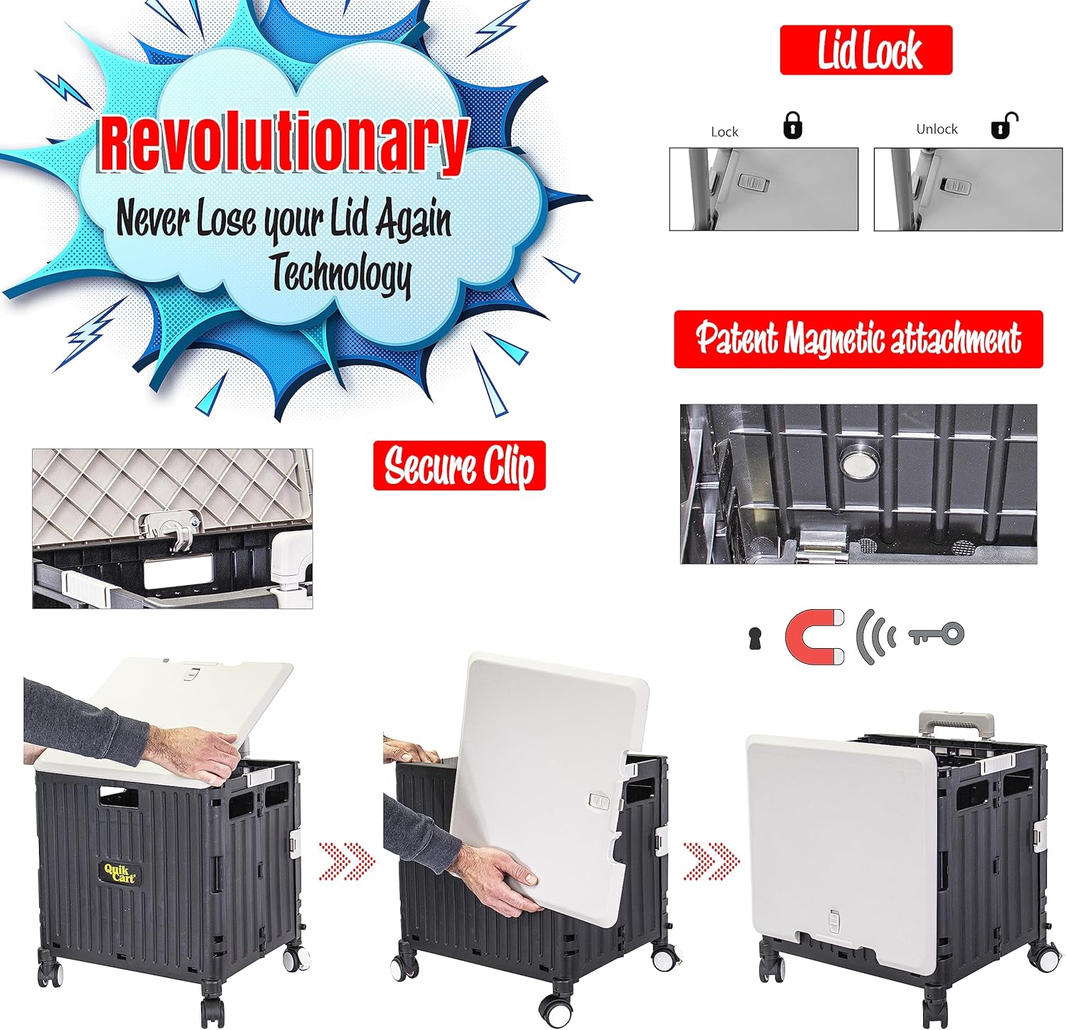 - Never lose your lid again: Revolutionary swing lid has a patented magnetic gyro system that allows you to swing your lid on and off the top while keeping your lid attached to the cart.Lid supports up to 250-pounds and may be used as seat or stepstool.