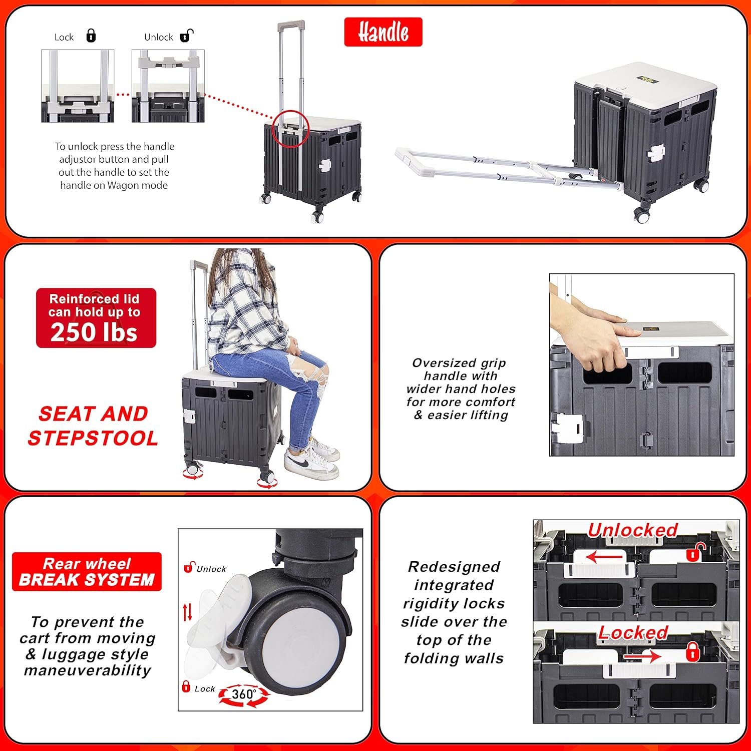- Two-Position Wagon Handle: Handcart contains an upgraded Dual retractable telescopic handle that can switch from the standard vertical mode to a haul-friendly wagon mode that gives you extra maneuverability while carrying supplies.
