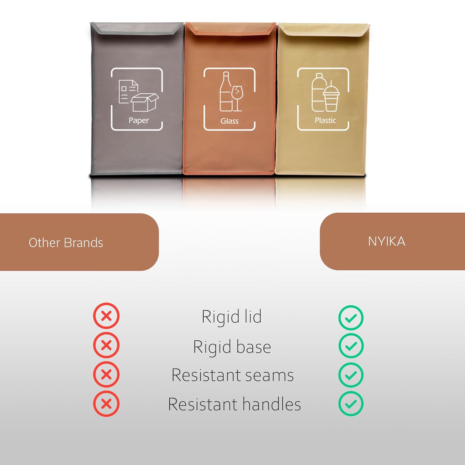 - Our recycling bags have excellent FEATURES such as their strong, semi-rigid material, which makes them collapsible, waterproof and easy to clean. They also contain a RIGID LID that makes recycling more convenient for any recycling bin kitchen.