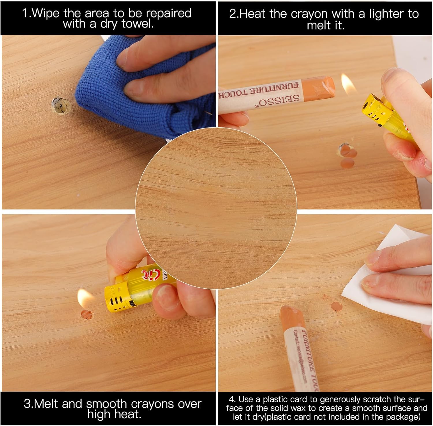 - How to Use: Choose a set of wooden crayons that match the color of your furniture. First, clean the area to be repaired with a dry towel or paper. If it is to repair the furniture whose surface is slightly damaged, you only need to gently wipe the damaged area. If it is a larger area, you can use a high temperature equipment to heat the wax, let the melted crayon drips all over the depression, then smooth it with plastic card and wait the wax dry. (plastic card not included in the package)