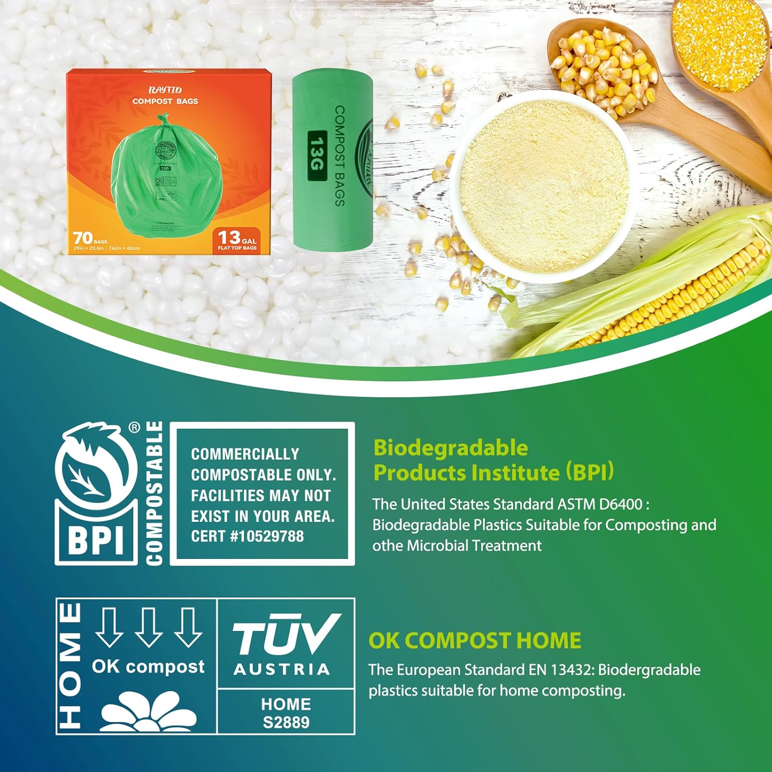 RAYTID 13 + Gallon Compostable Trash Bags,70 Count, Extra Thick 1.1 Mil, Tall Kitchen Food Scrap Waste Bag, ASTM D6400, US BPI and OK Compost HOME Certified
