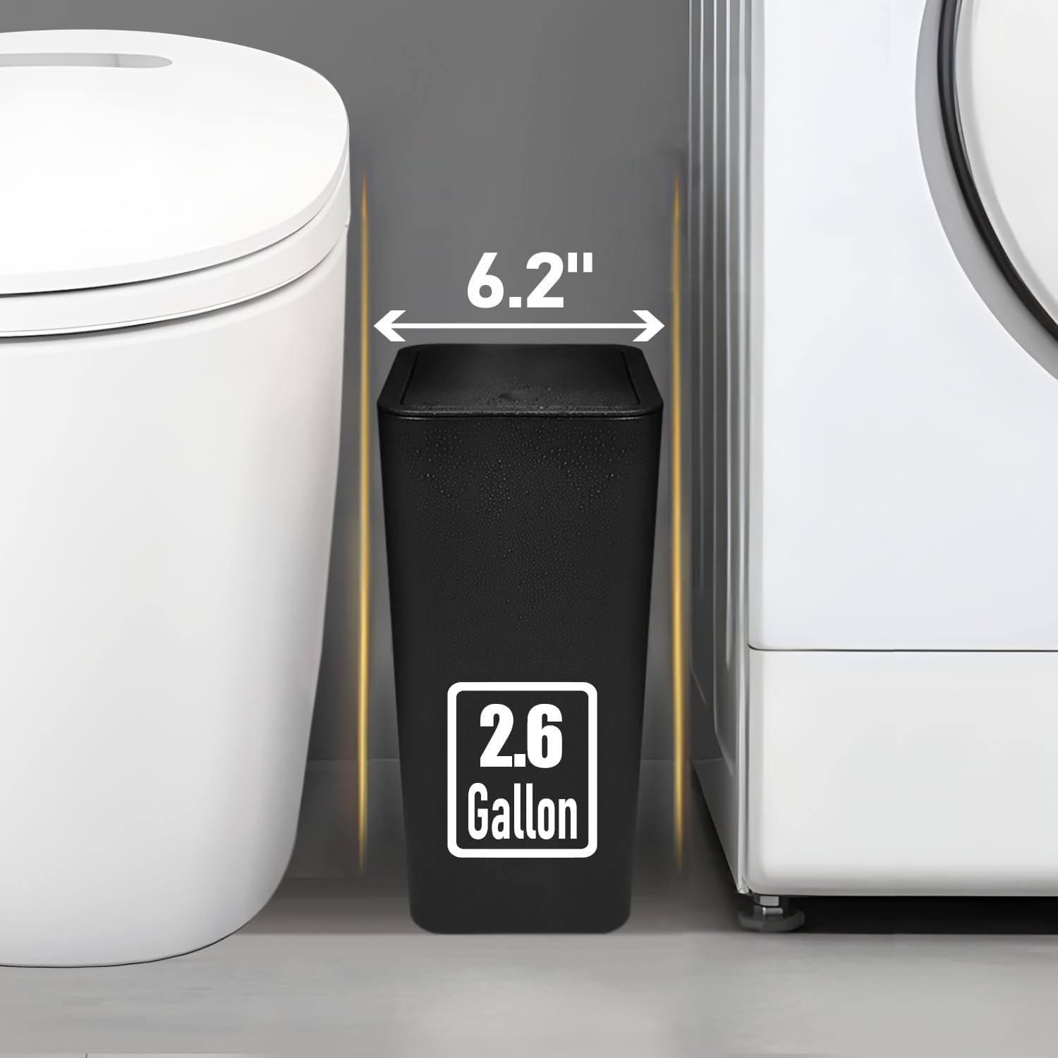 - Small Enough to Fit: The compact design of this trash can make it ideal for small spaces. The slim feature makes it fit perfectly into corners and narrow areas in kitchen, bedroom and bathroom, etc.