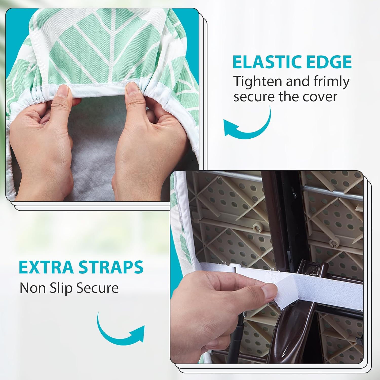 - HOOK AND LOOP FASTENERS AND ELASTICIZED EDGES: Come with two hook and loop fasteners can pull the cover surface tight and straight with tension straps for universal fit. The tailor made high quality elastic skirt can firmly fix the ironing cover so that it is tightly attached to the ironing board