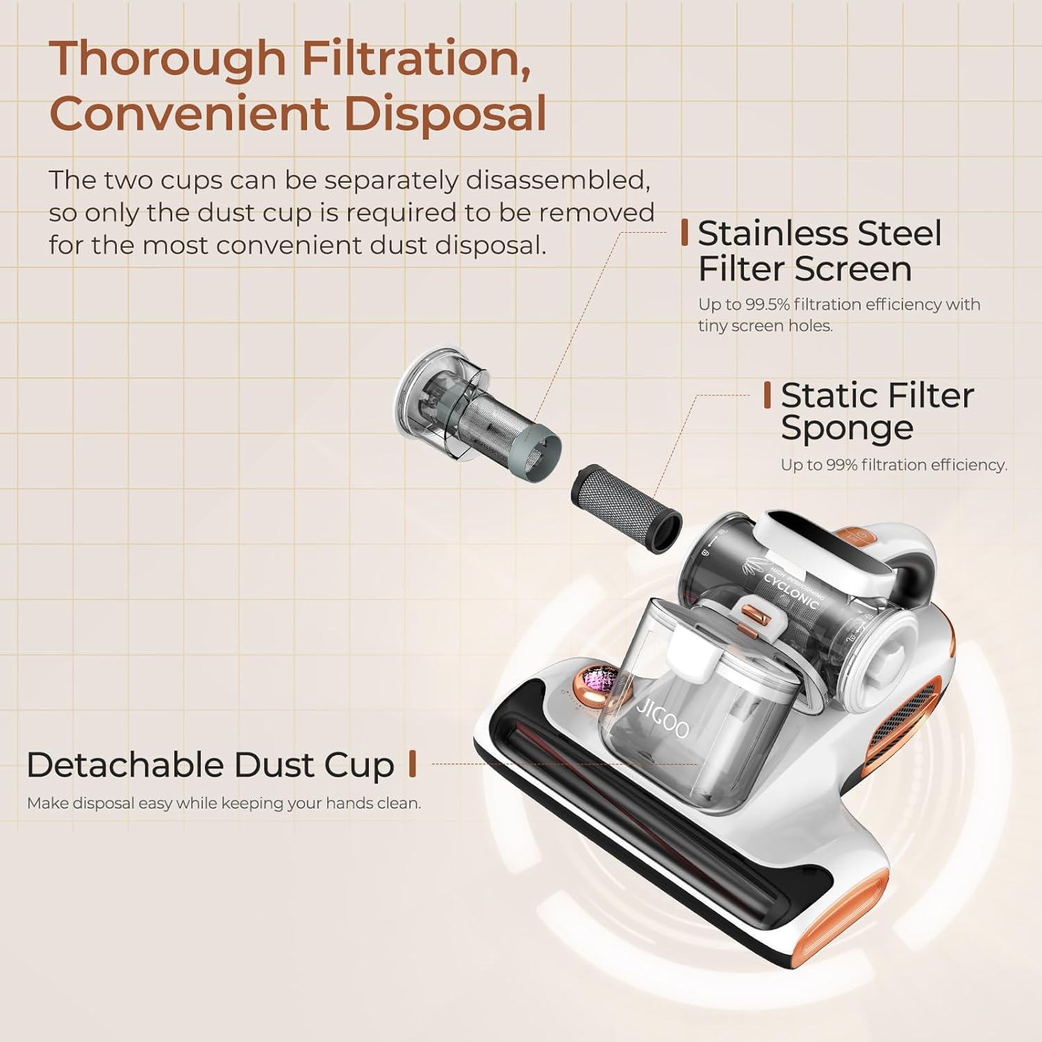 - [ Latest High-end Mattress Vacuum ] Jigoo T600 bed vacuum with a 140°F constant temperature heat air to keep surface dry and clean. Creative silent-airflow noise reduction tech ensuring you won't bother anyone with annoying sounds, with a maximum noise ≤72DB.