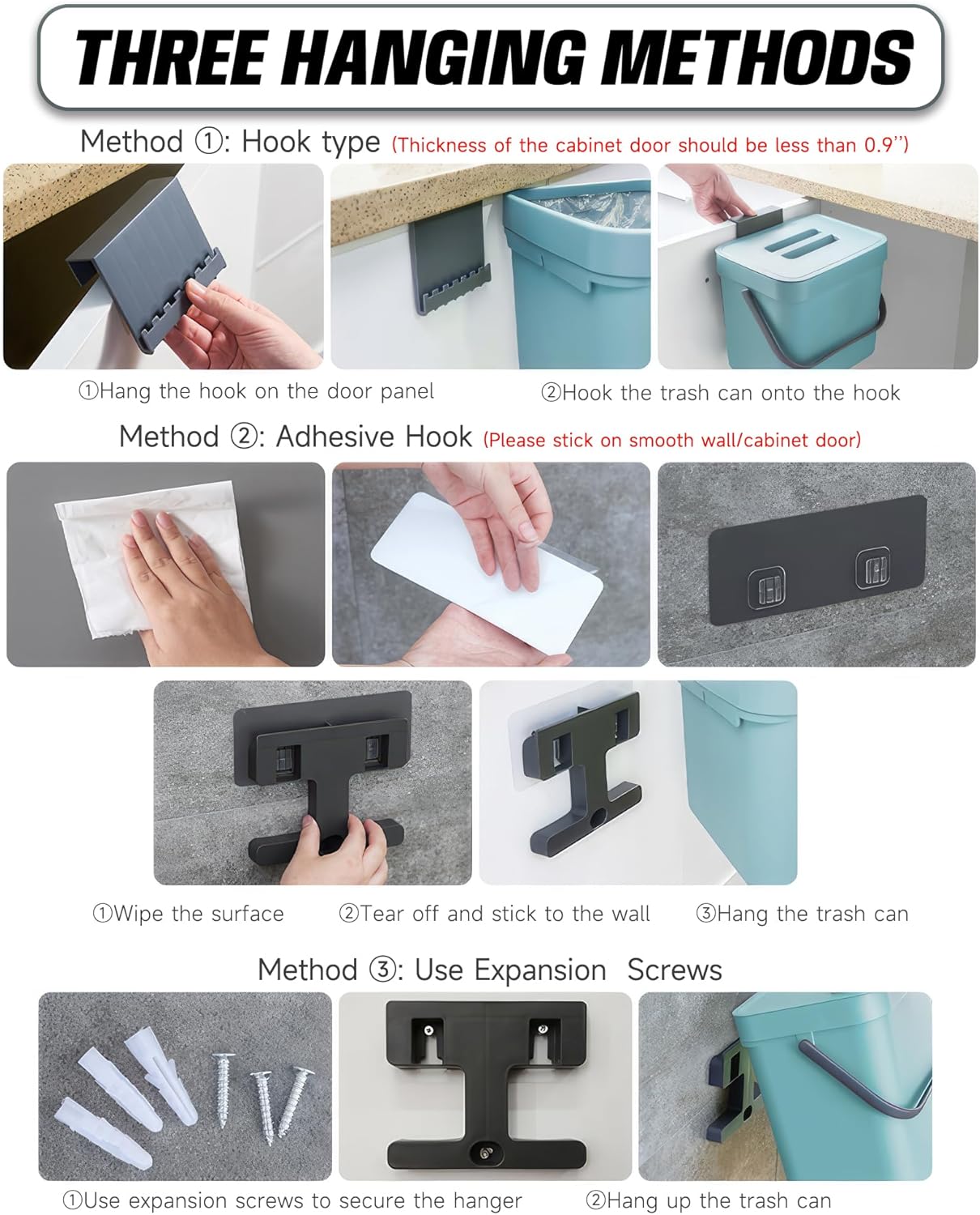 - โ [Under Sink / Wall Mount Trash Can] Hanging trash is an excellent choice for your daily activities. You can use it while you cook and then store it under the sink. Fit for most cabinet doors, pantry doors, cupboards, under sinks, walls, and countertops.