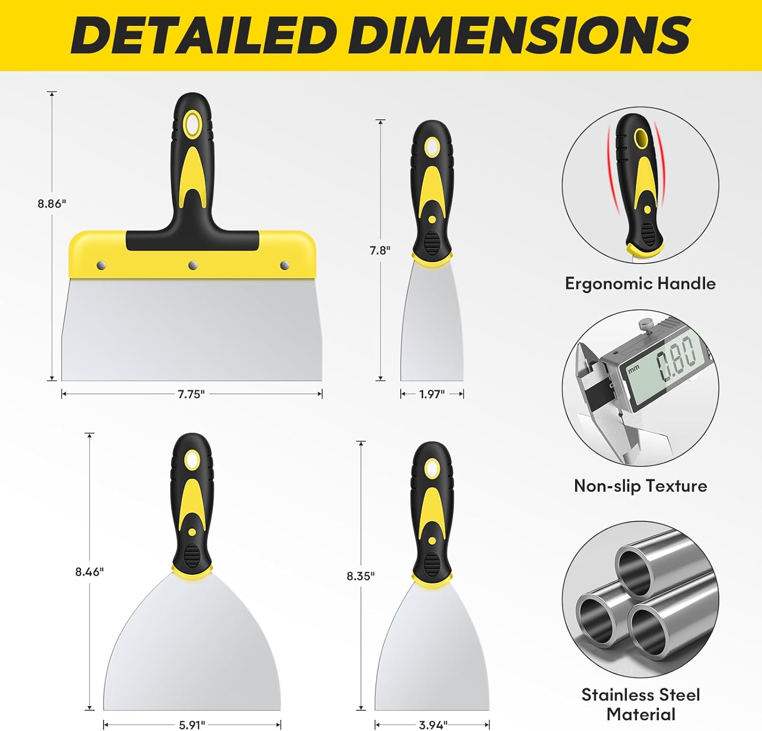 - Versatile Sizes: This putty knife set includes four paint scrapers in sizes 2", 4", 6", and 8". With these different sizes, you can easily meet all your daily work needs. The smaller sizes are ideal for applying adhesives and drywall tape, while the larger sizes are perfect for applying putty, plaster, and other home improvement works, meeting your different requirements