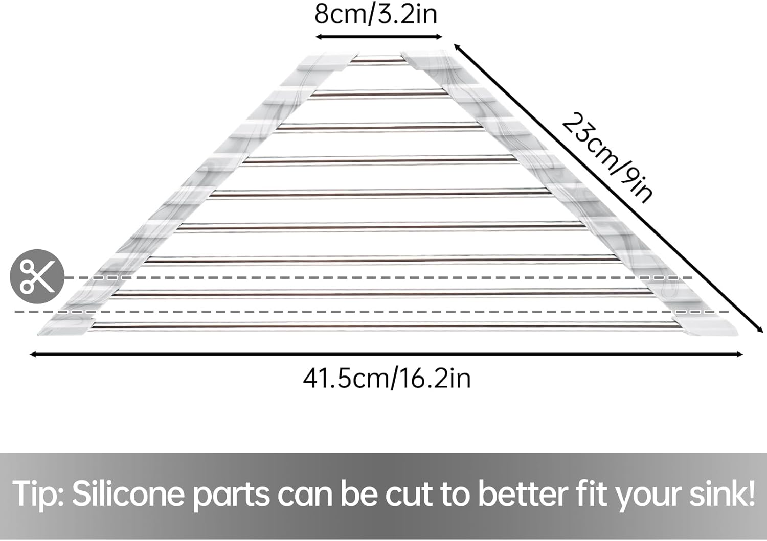 - âď¸ăSmall Over Sink Drying RackăA handy tool that allows you to easily rinse and dry small items to keep your kitchen clean and organized. The triangle shape makes full use of your kitchen sink corner space and is designed for maximum stacking ability to efficiently dry dishes with proper drainage and ventilation. Top Length: 3.2â, Bottom Length: 16.2â, Side Length: 9â. Color: Marble.