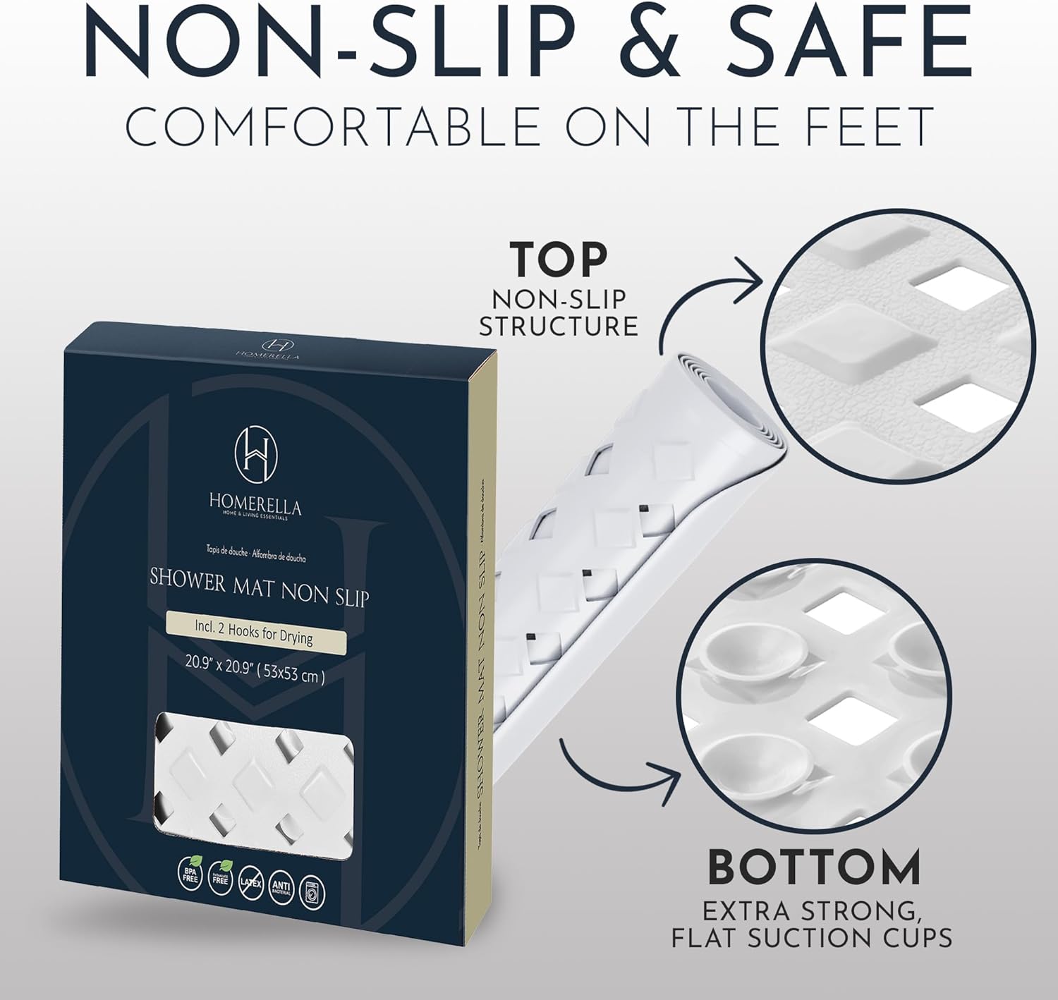 - Non-slip? Safe & Secure - The Homerella shower mat non slip anti square has over 250 anti-slip suction cups on the bottom for optimum grip. The top of the shower drying mat has a special anti-slip structure!