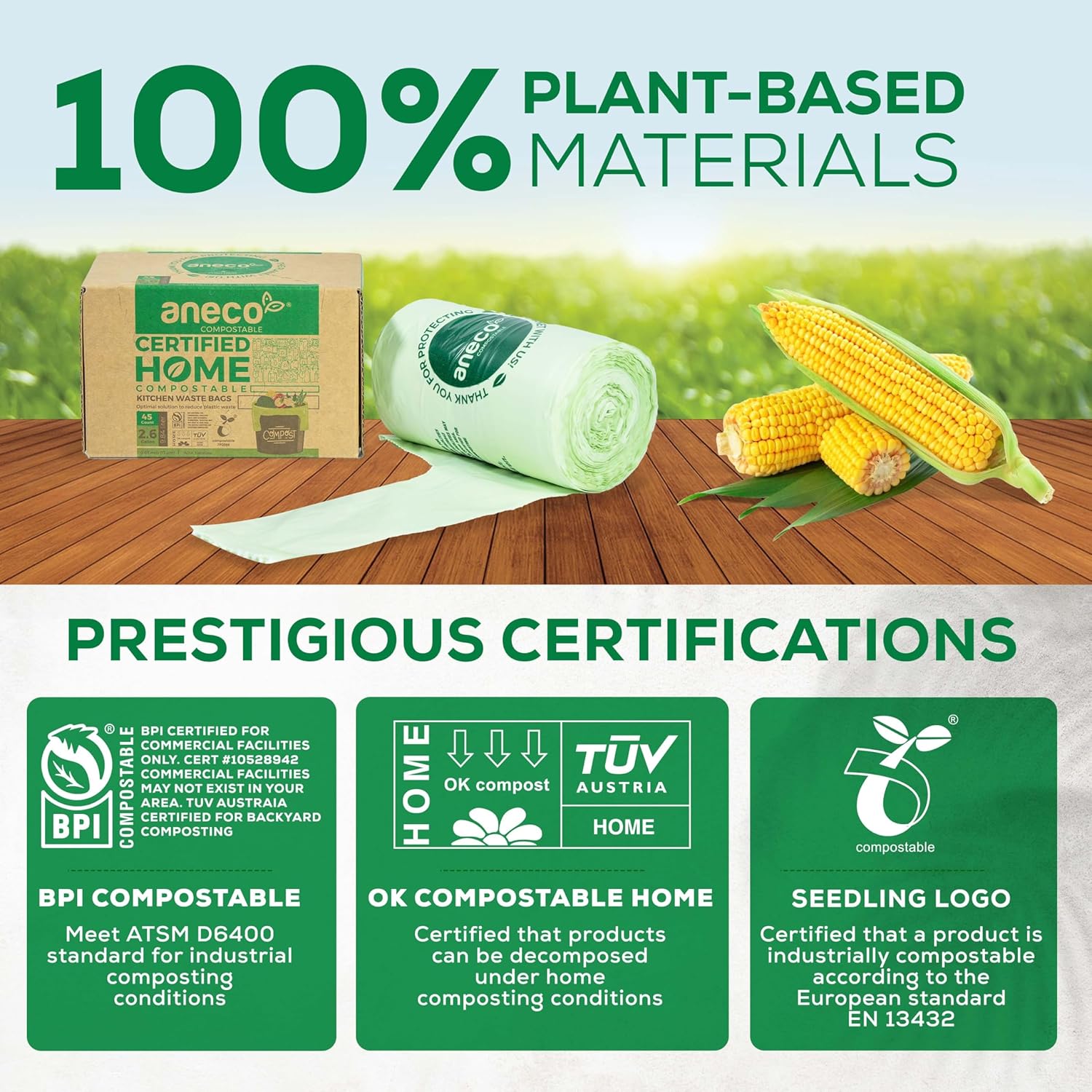 - π Made from entirely renewable resources such as corn starch and plant-based materials, ANECO compostable bags 2.6 gallon decomposes naturally into CO2, water and organic biomass within one year, leaving no traces of plastic in the environment. It also meets strict standards and earned prestigious certification from BPI Compostable (US standard ASTM D6400), TUV Austria (OK Compost Home) and European Bioplastics (Seedling Logo) so you can totally buy with confidence.