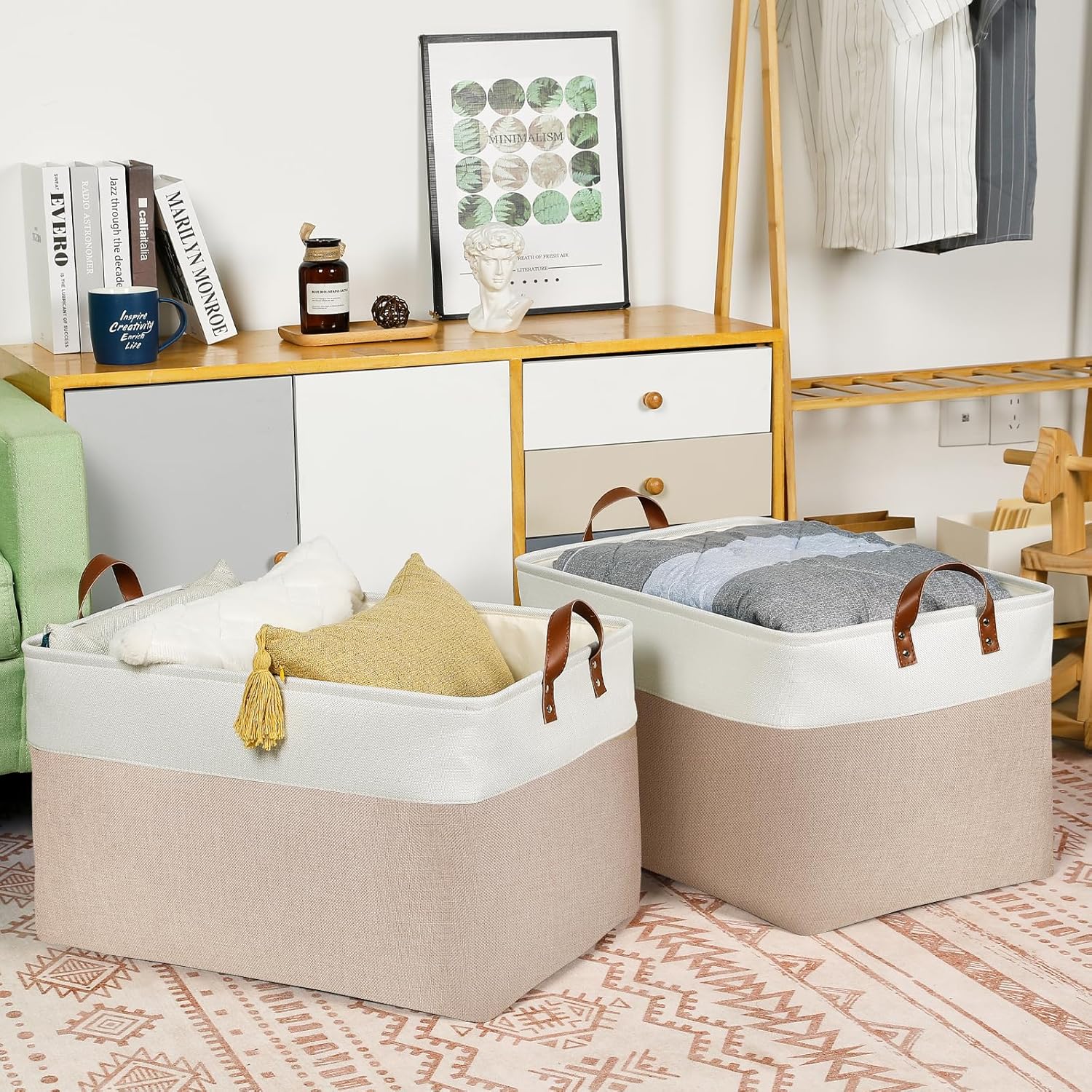 DULLEMELO Extra Large Baskets for Organizing, 22" X 15" X 13" Rectangle Fabric Storage Bins, Foldable Blanket Basket Living Room, Large Kids Toy Storage Organizer Bins, Baby Basket Gift (White&Khaki)