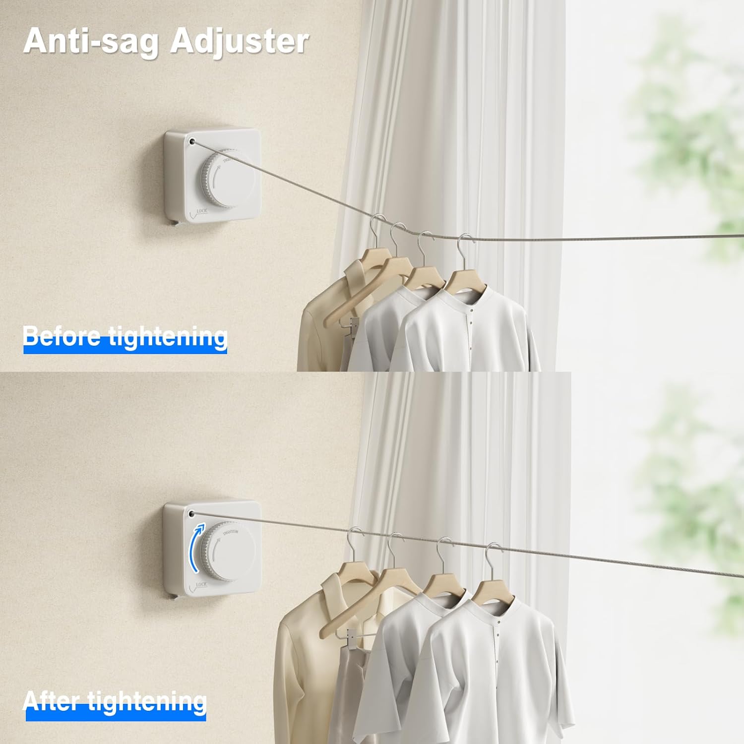 - 【Non-Sagging Design】The Retractable Clothesline is a non-sagging design, there is a locking device and a rotating tightenable device, when you hang a lot of clothes resulting in sagging, keep the locked state and then rotate to tighten the line can solve the problem of sagging. Such a very careful design is not available in others' clotheslines.