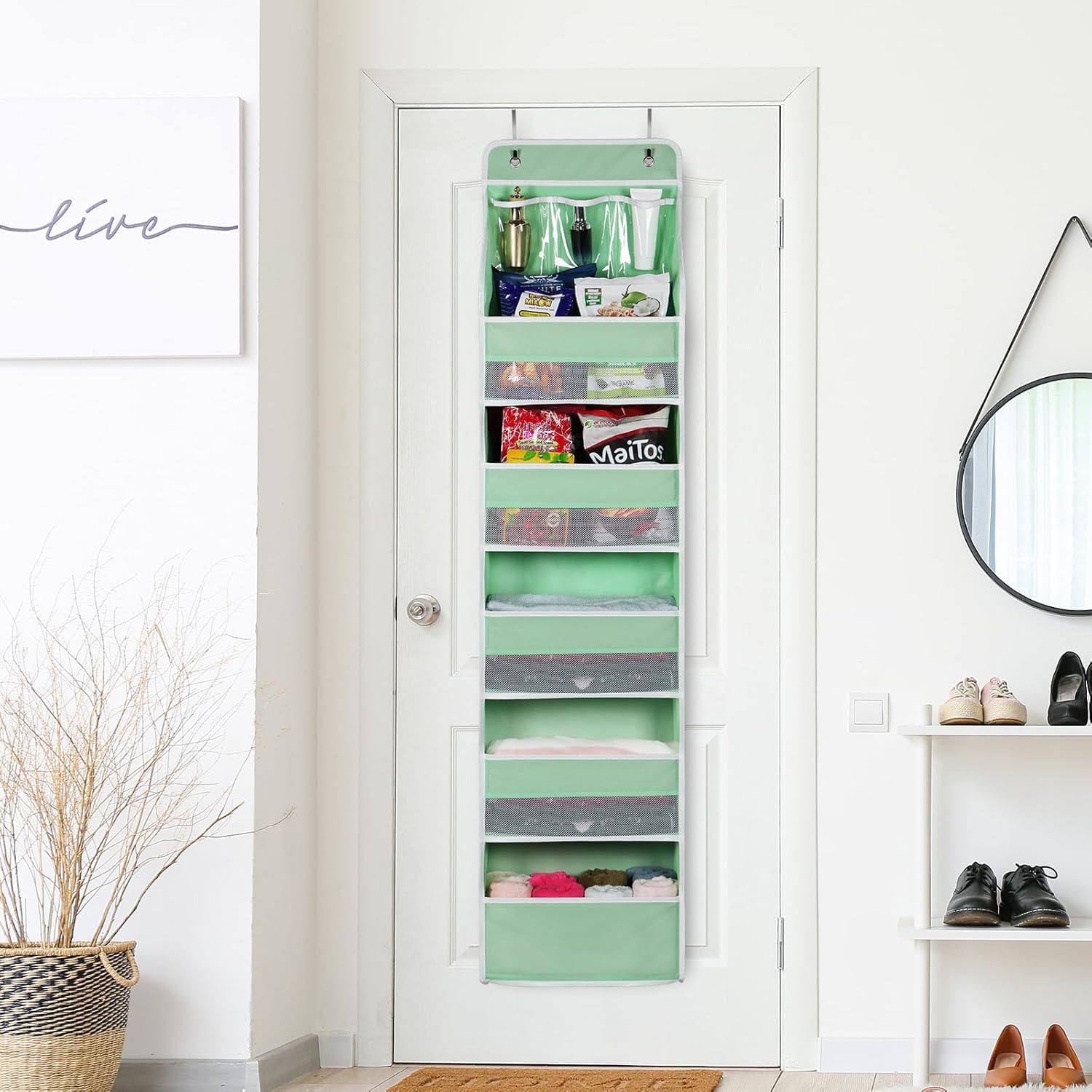 Univivi 6-Shelf Over Door Hanging Organizer Fabric Baby Door Storage with 5 Large Pockets and 3 Small PVC Pockets Wall Mount Hanging Storage Organizers for Baby Essential (Green)