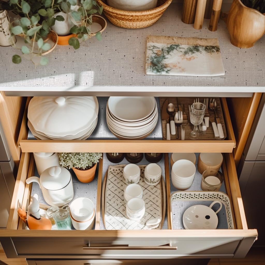- SHELF LINER: Unique drawer liner design makes you stand out from the crowd of drawer liners. Made from premium thickened material, these non-adhesive shelf anddrawer liners are durable, tear-resistant, and reusable.