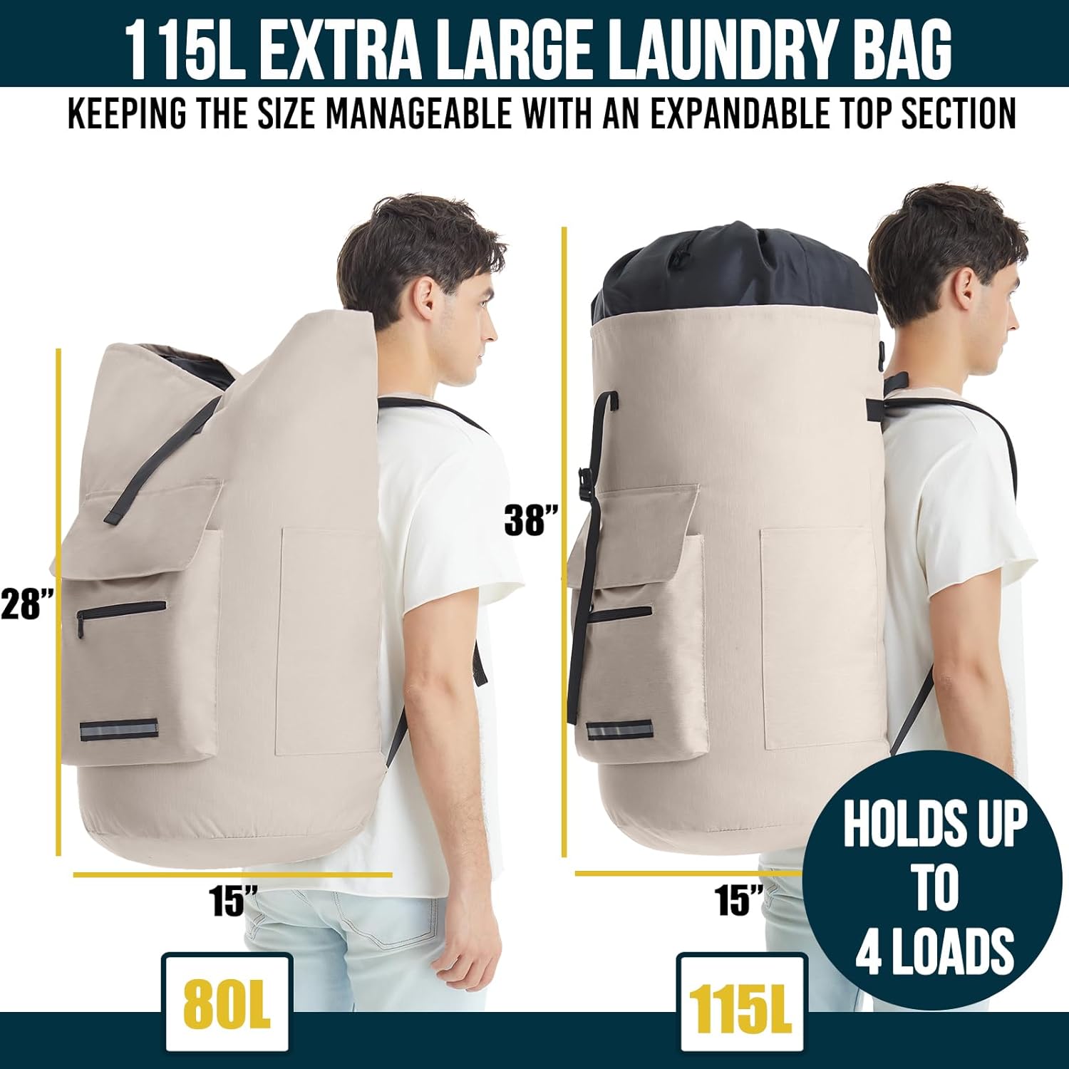 - Please note: non-self-standing design when empty; The laundry bag measures 28" H x 15" D, with an expandable top section that stretches to 38" H, providing a generous capacity of up to 115 L, equivalent to 3-4 loads of laundry; It also has a drawstring and buckle closure to prevent laundry from falling out as you transport it; Aside from the XL size, it’s also tougher, with 900D oxford and reinforced stitching on all sides; The laundry backpack can hold all the laundry you can fit in the bag