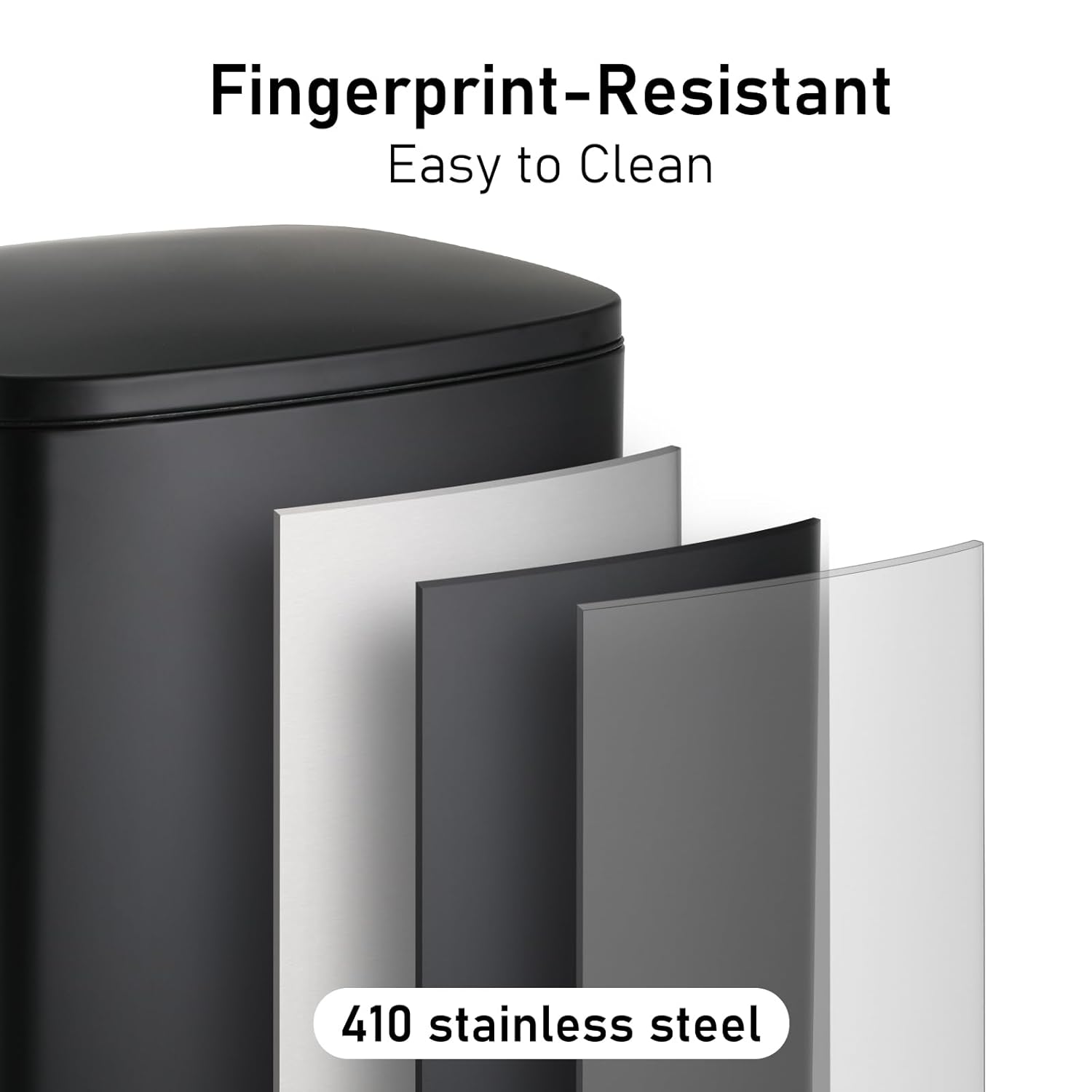 - 【410 STAINLESS STEEL】5/50L kitchen trash can is made of 410 stainless steel and adopts a wire drawing process. It has a delicate appearance and is easy to clean. It also remains bright and new after long-term use. With the oval shape, it can add elegant and fashionable decoration to your home or office.