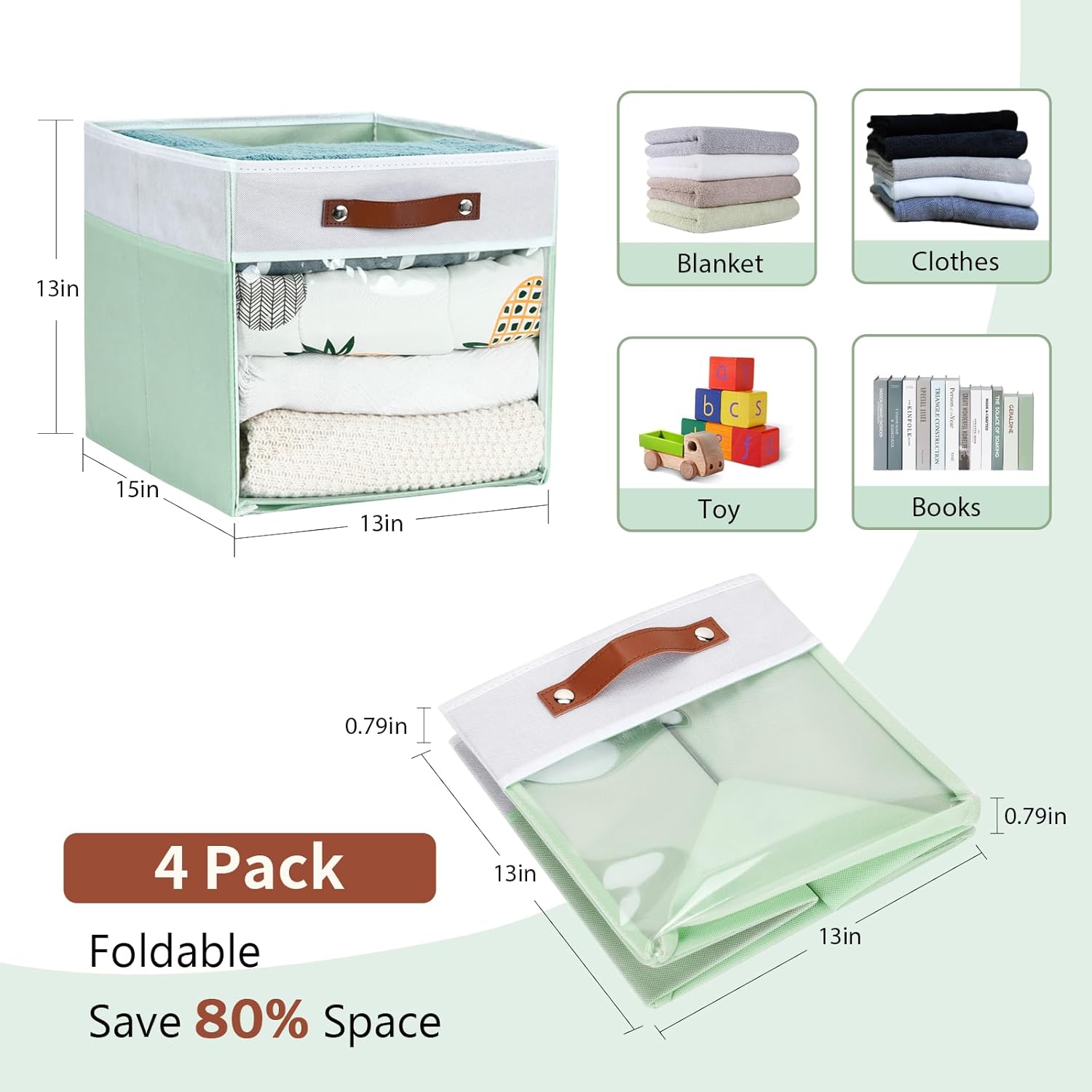 HNZIGE 13x15x13 Cube Storage Bins, 4 Pack Fabric Clear Organizer With Window, Large Collapsible Shelf Bins for Closet, Toy, Clothes - White Green