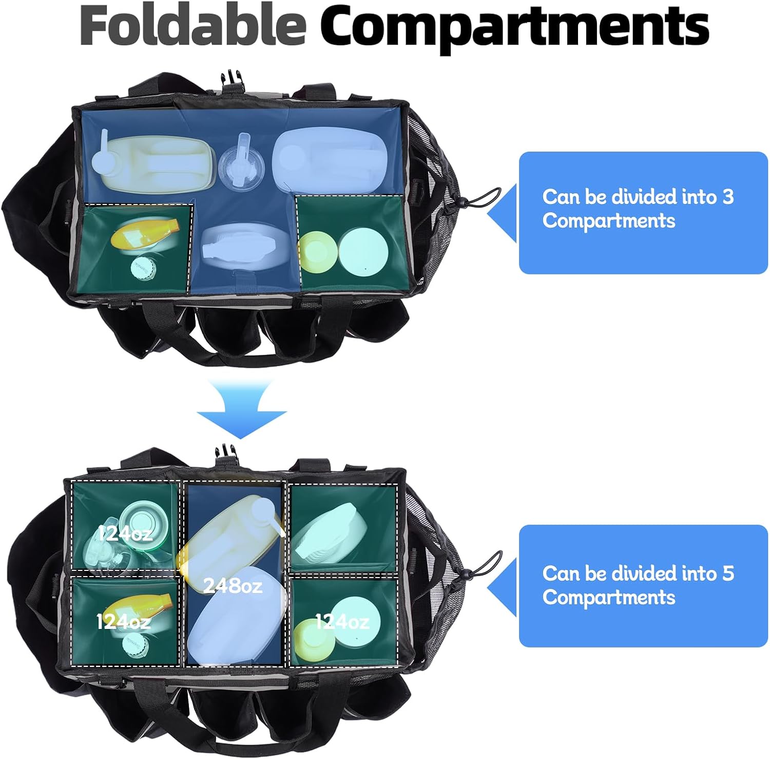 - Compatments Foldable: Can be divided into 1 to 5 compartments, fitting big and small supplies.