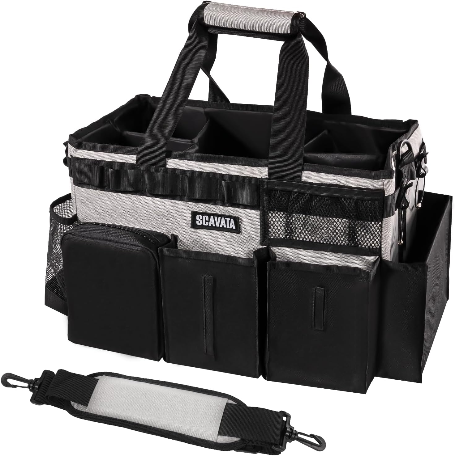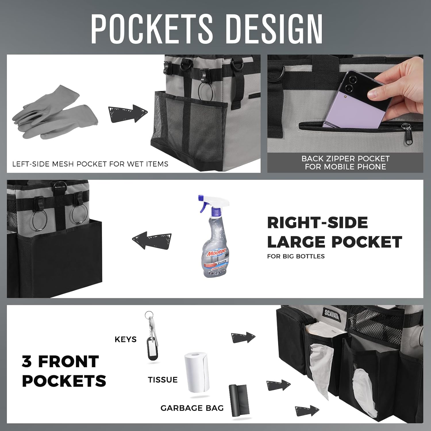 - Exquisite Details: The 5 inner compartments are large enough for organizing cleaning tools. 3 individual deep outer pockets, 1 mesh side pocket and 1 trash bag dispenser allow you storage and access of other cleaning tools. Also, securely zipped pocket is design for safely storing your important items